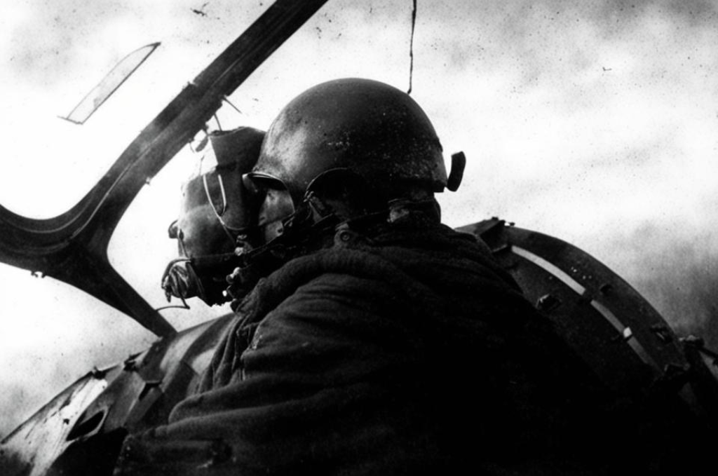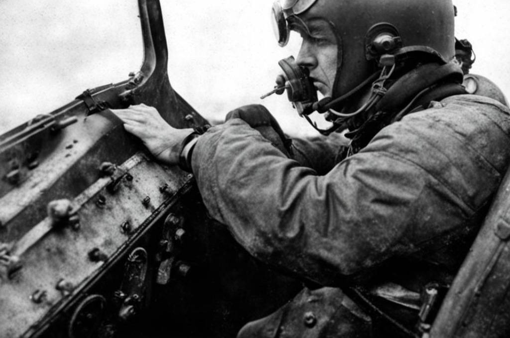 Летчик истребитель идет в бой. Вторая мировая война. Ему страшно.