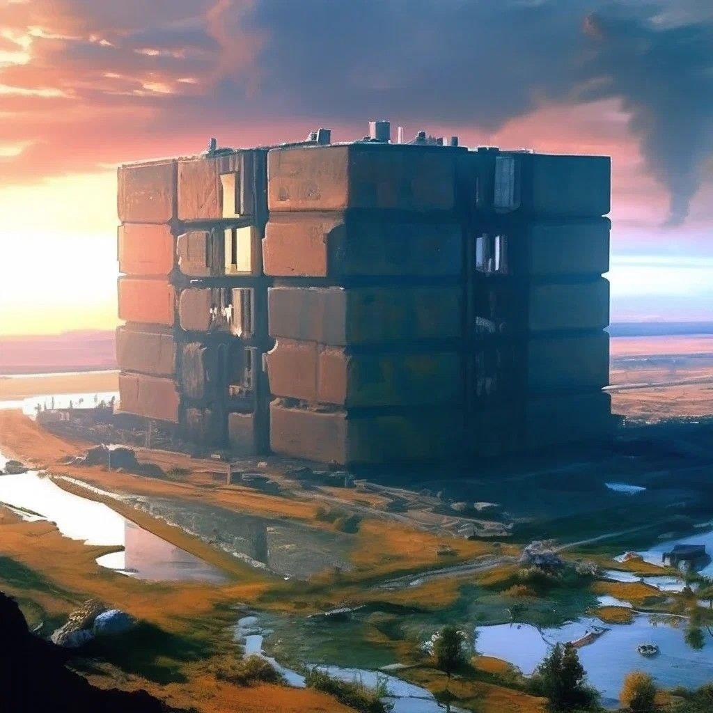 "Линда бросила взгляд на уродскую конструкцию убежища, благодаря которому человечество смогло выжить в пост ядерном мире. Местами покосившиеся, гигантские чёрные плиты из железа и бетона. Огромный квадратный монолит, пожирающий свет, остающийся чёрным даже в бликах тысяч прожекторов и маячков. Гигантский паук с поджатыми лапками и шерстью в виде множества вышек и антенн для поддержки связи со спутниками и другими секторами. Весь переплетённый трубами, испускающий в мир тонны пара и дыма из огромных воронок, служащими одной массивной охлаждающей конструкцией. Врата в корпоративную преисподнюю."