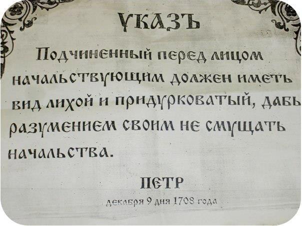 Указываю впредь, перед ассамблеей мыться с мылом в бане со тщением и не токмо за чистотой верхней робы, но и за исподним такожды следить усердно, дабы гнусным видом своим не позорить жен российских.