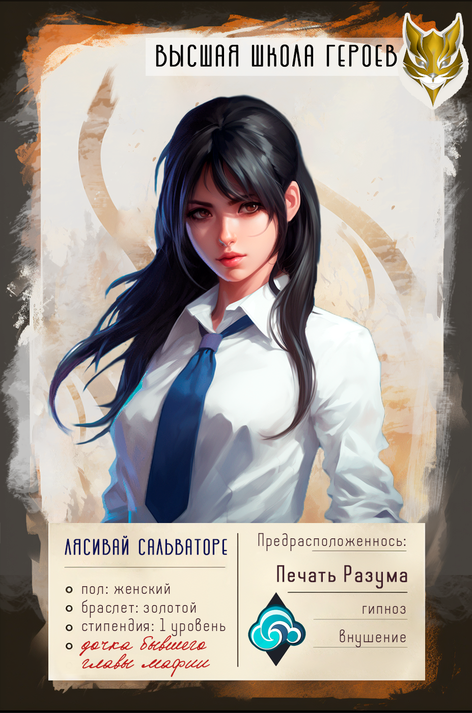 Автор: Николай НекрасовЛясивай Сальваторе (или по-простому Ляся) персонаж лично мне очень приятных. Барышня серьезная, сдержанная, но в то же время пылкая сердцем.