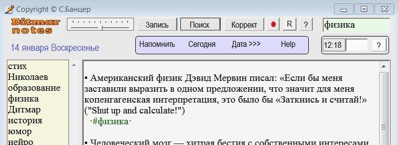 Автор: СержДля пакета Ditmar - новое приложение Ditmar.notes. Удивительно, но вроде как нет нигде блокнота с релевантным поиском. Да ещё с регулируемой слайдером степенью релевантности. Или есть, но я не видел. В копенгагенской интерпретации кв. мех. - это одно и то же.