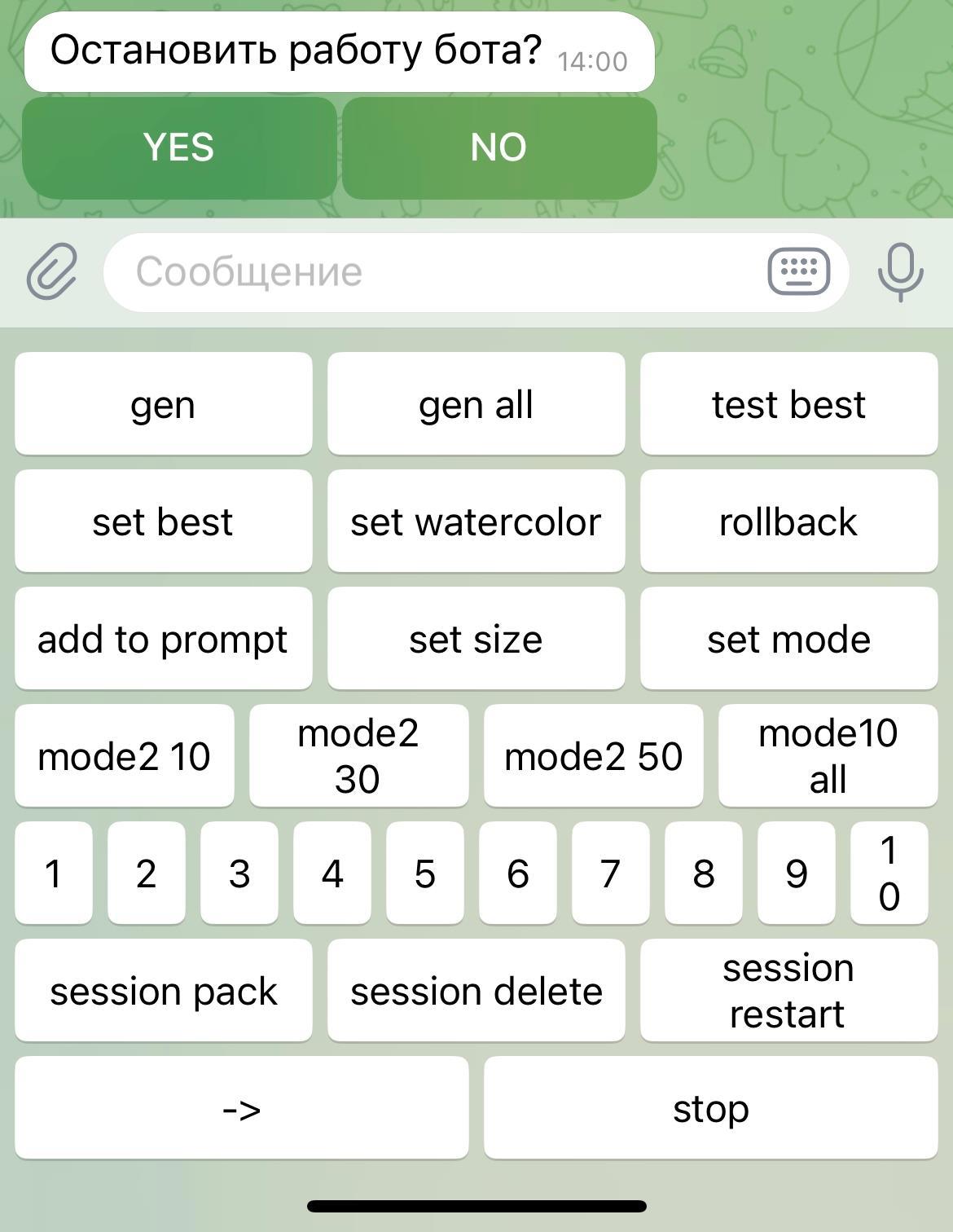 Ранее кнопка stop сразу вырубала бот. Всё бы ничего, но иногда при работе с Reply-кнопками случайным образом можно было не попасть в нужную кнопку, и жмякнуть этот несчастный stop. В результате чего бот останавливался, терялись все несохраненные генерации, нужно было по новой запускать... короче данная доработка — чисто подстраховка от корявых пальцев.