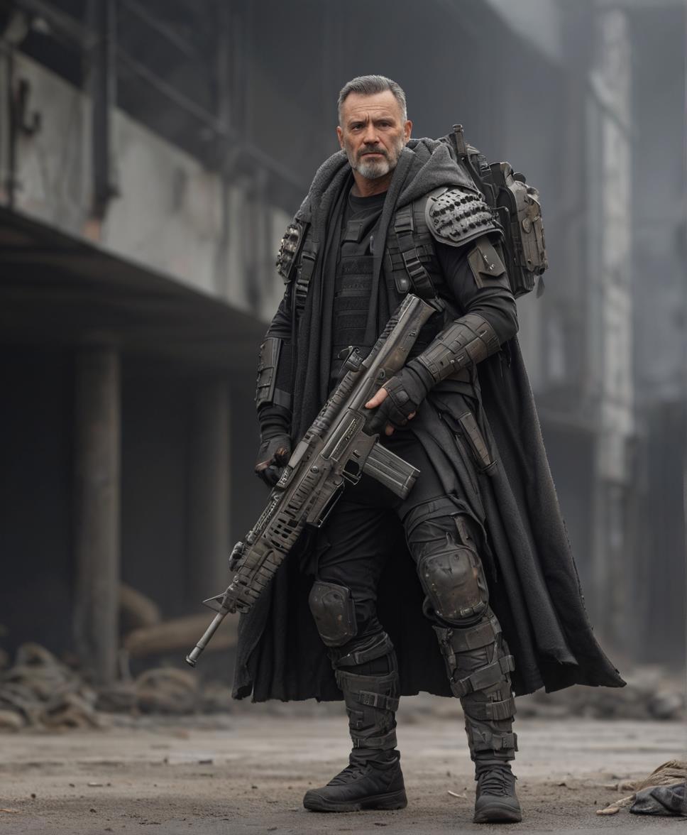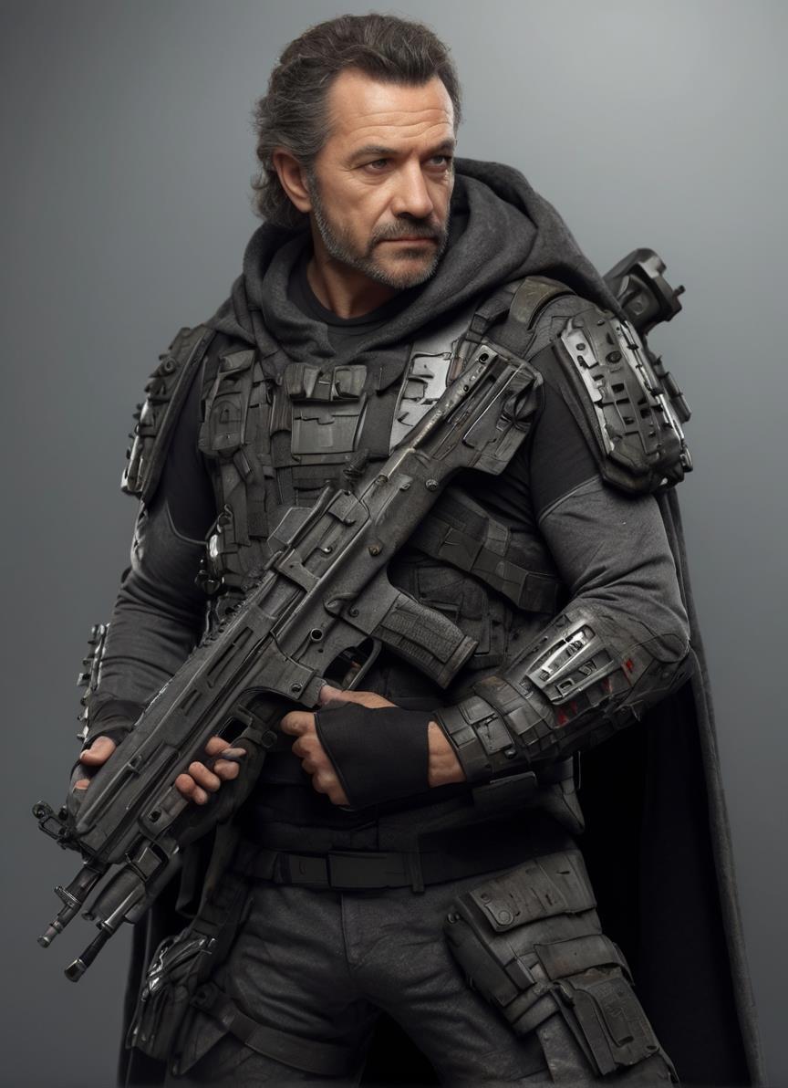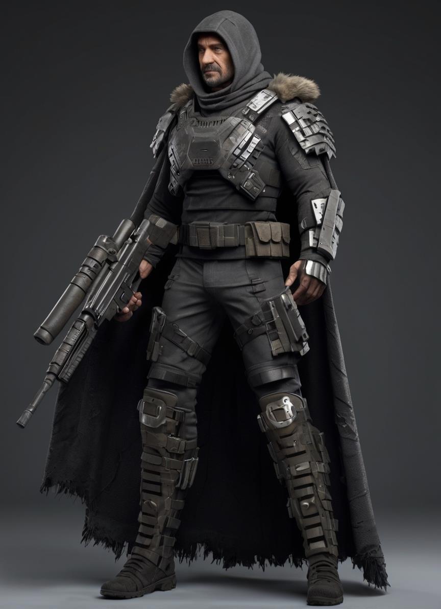 Вот, тут, как бэ, легко догадаться, какие элементы откуда взял. (Оружие нейросеть вообще не хочет генерировать. А то, что она генерирует, больше напоминает помесь штопора и мясорубки. Поэтому пришлось искать нужный ствол, под нужным ракурсом на фото.)