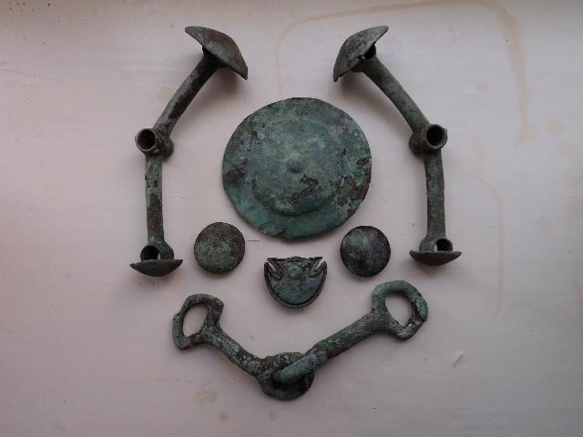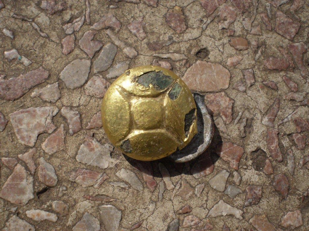 Киммерийцы не создали звериного стиля как скифы. Они любили иные сюжеты. Пожалуй, самым распространенным является солярный символ в виде круга, разбитого на несколько секторов. Этот орнамент они лепили всюду, особенно на всякого рода конских бляхах. Вот пример одной такой бронзовой бляшки, обтянутой золотым листом.