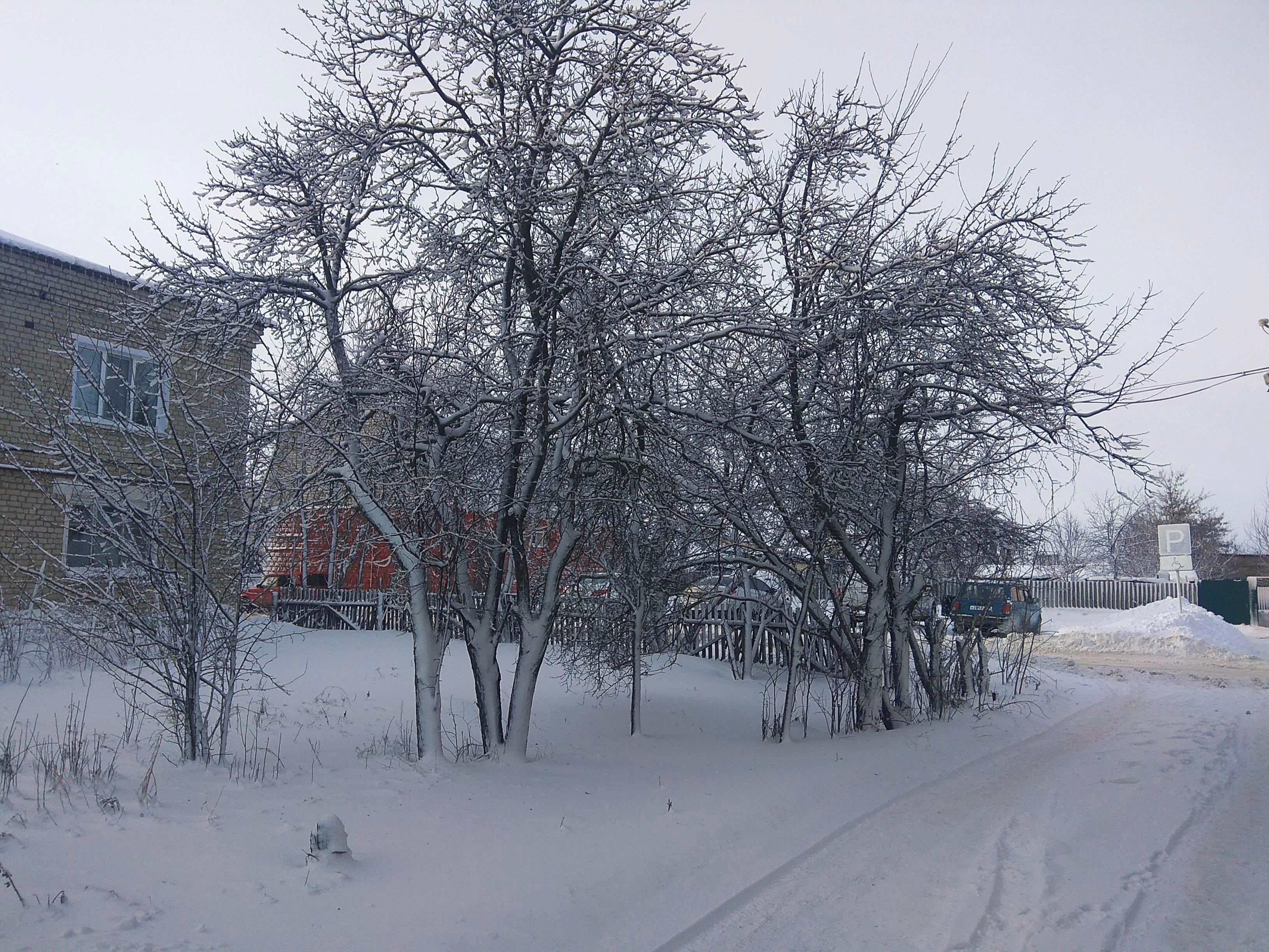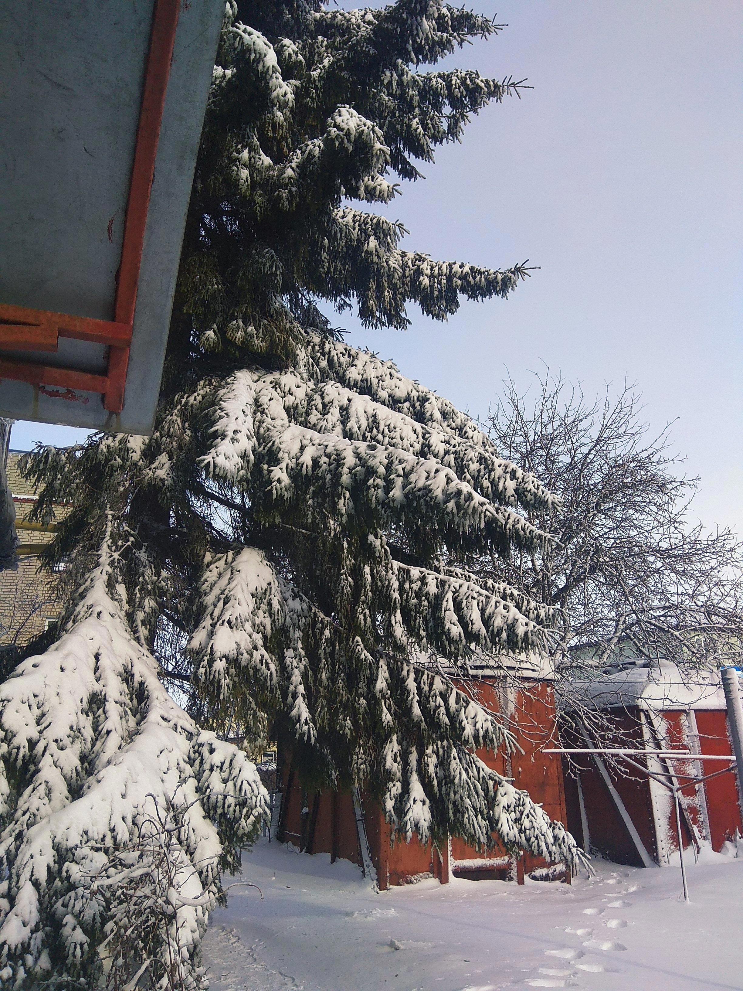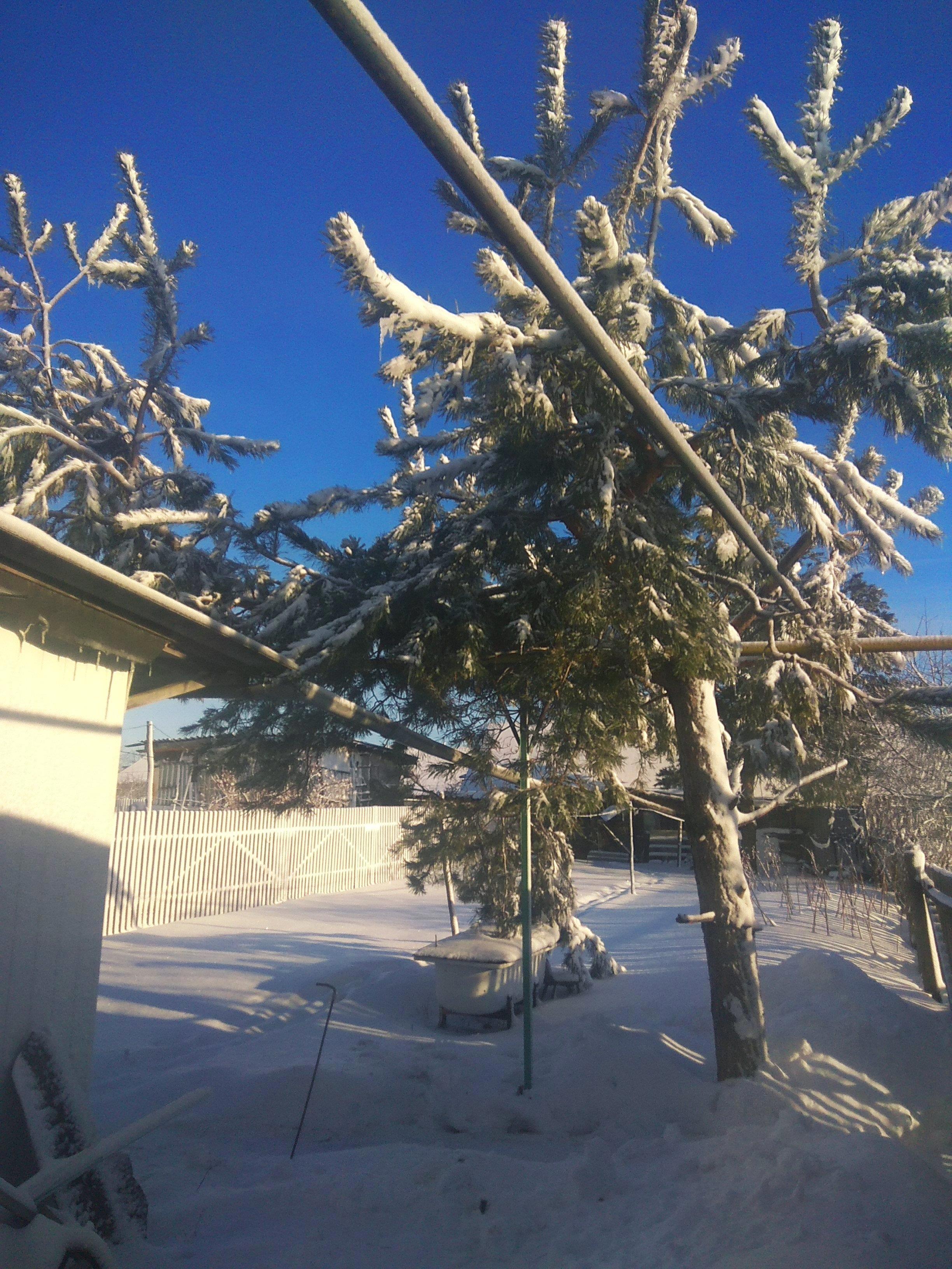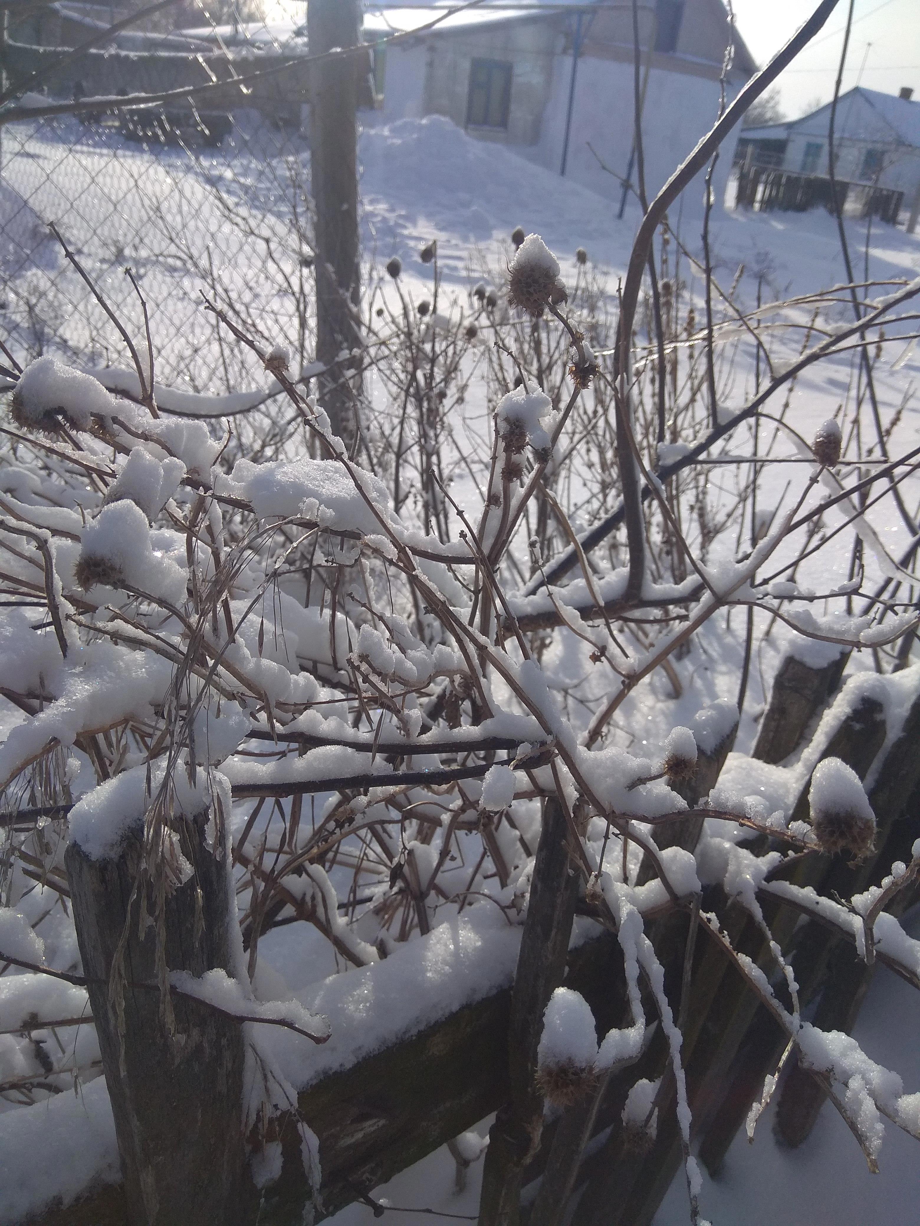Обратите внимание на соседский забор -- он весь в снегу! И вообще всё уже второй день облеплено снегом -- столбы, деревья, дома, заборы, -- потому что позавчера целые сутки мёл мокрый снег и сразу же замерзал!
