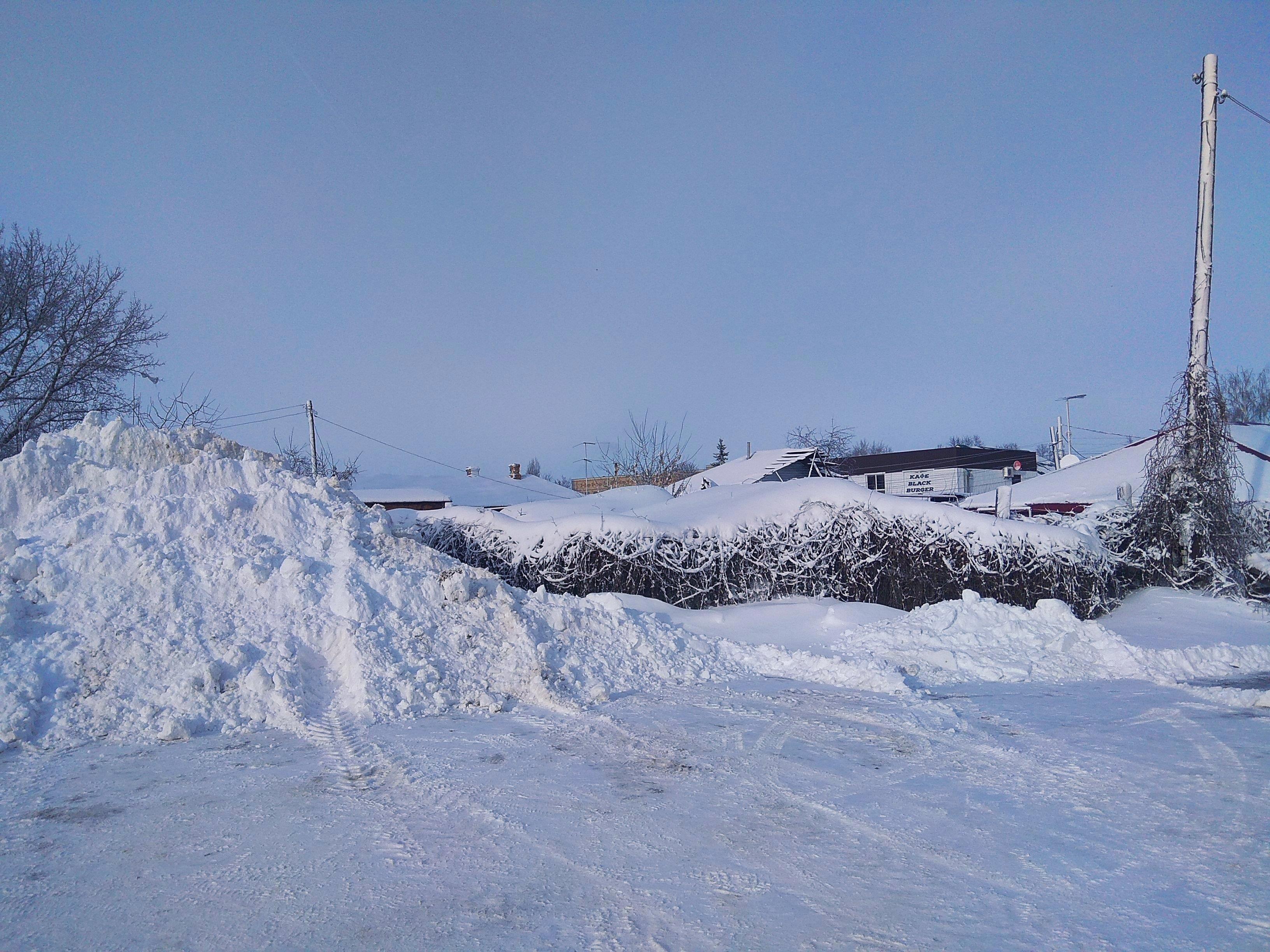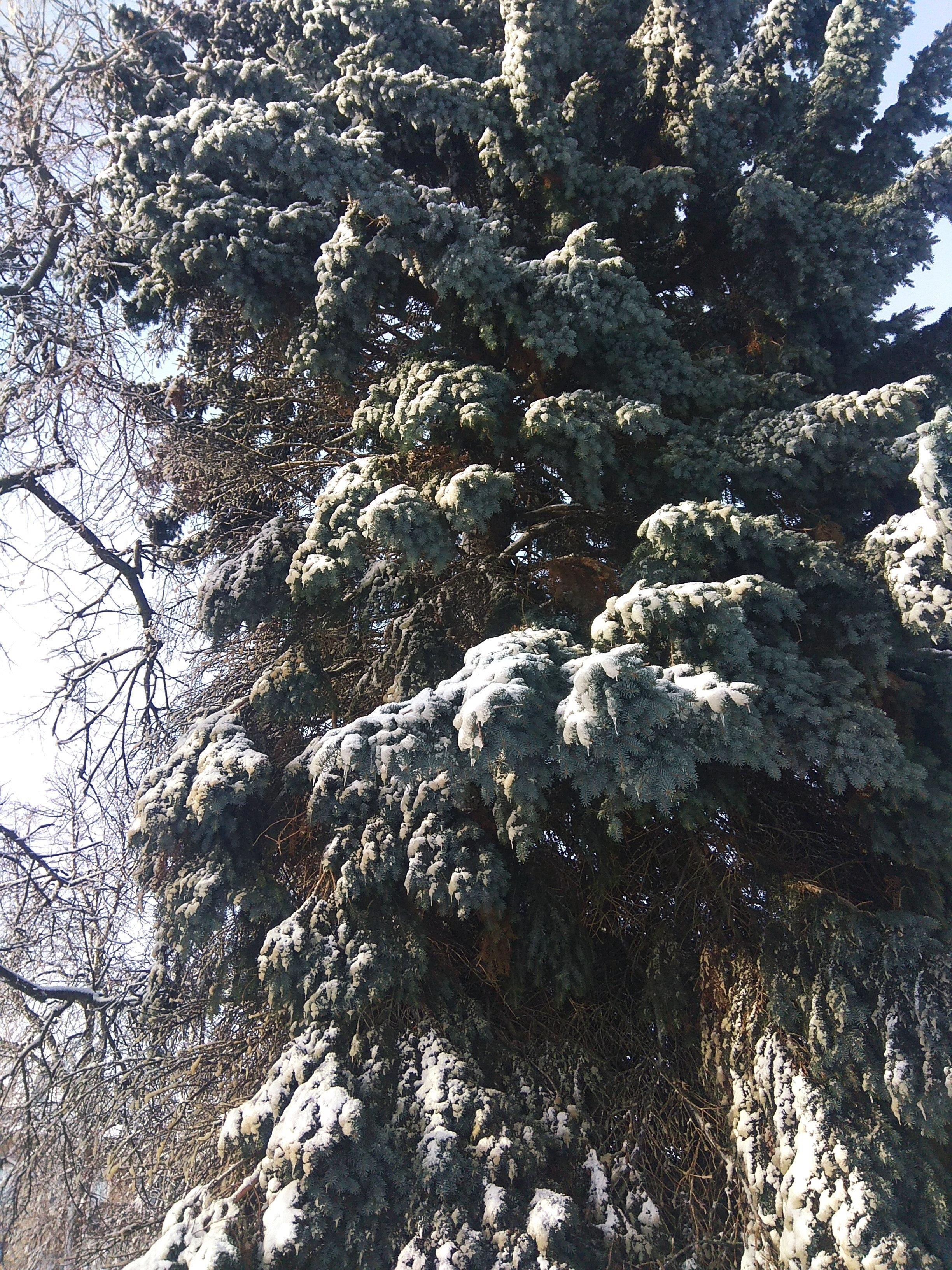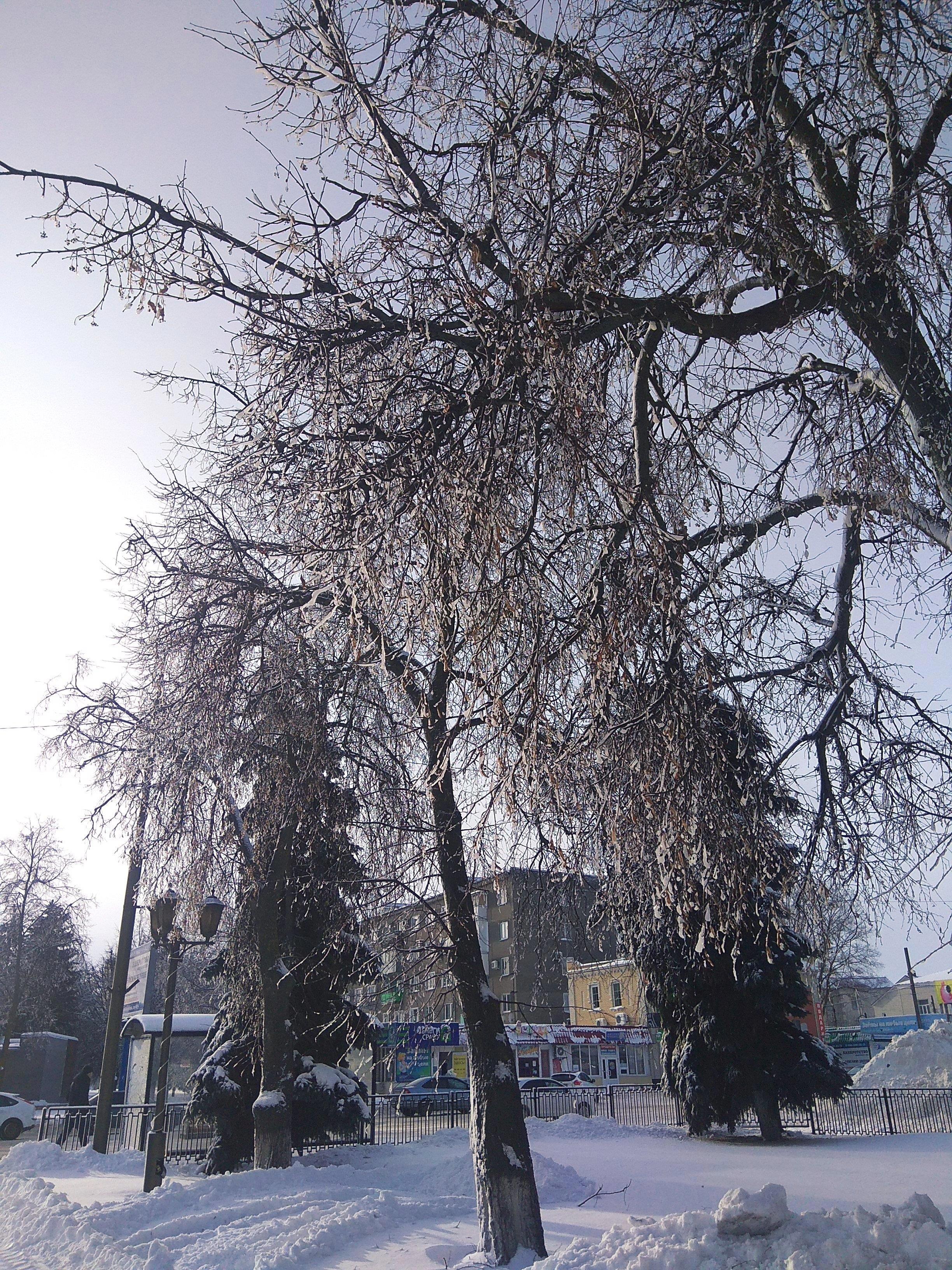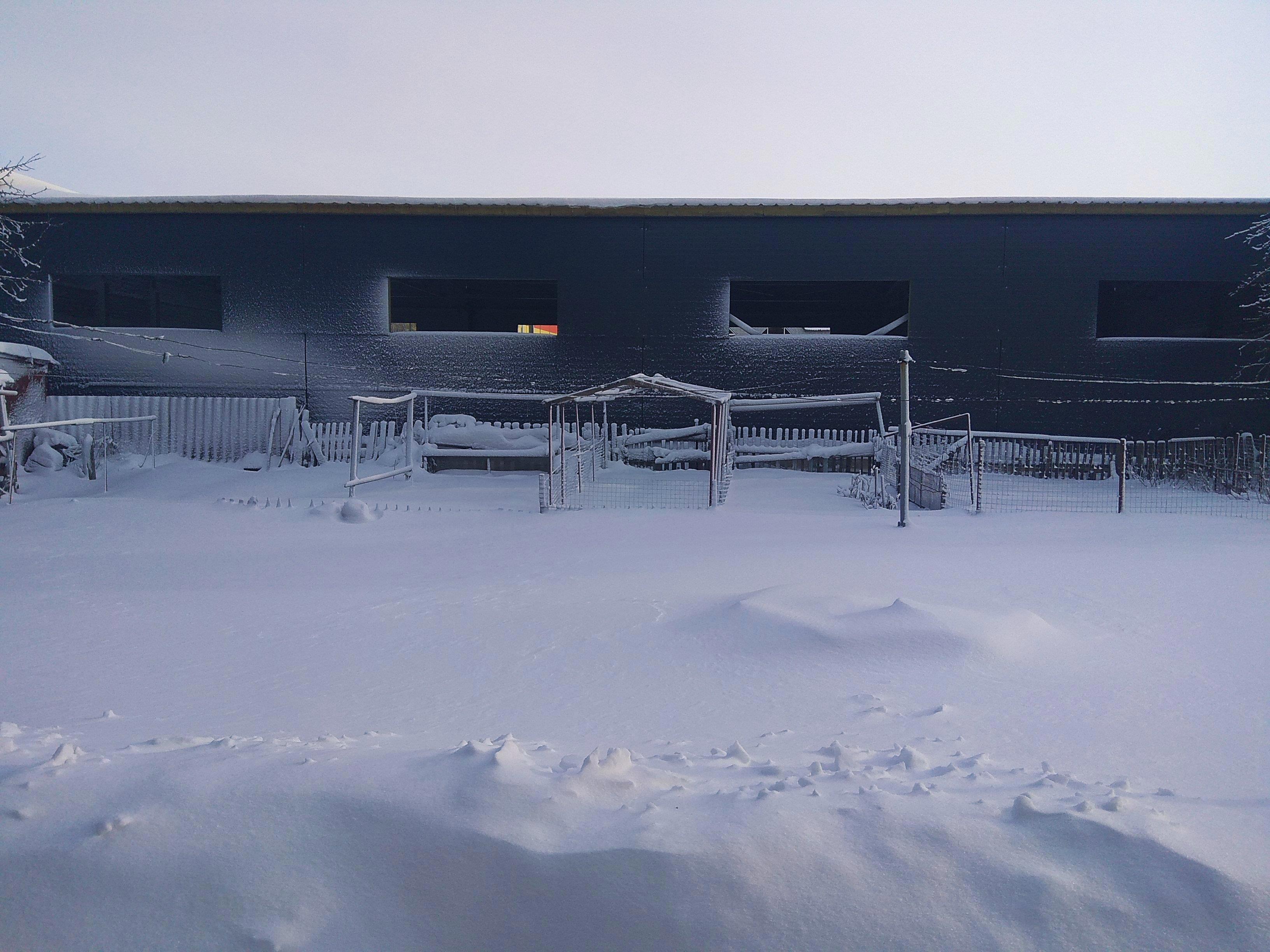 Обратите внимание на соседский забор -- он весь в снегу! И вообще всё уже второй день облеплено снегом -- столбы, деревья, дома, заборы, -- потому что позавчера целые сутки мёл мокрый снег и сразу же замерзал!