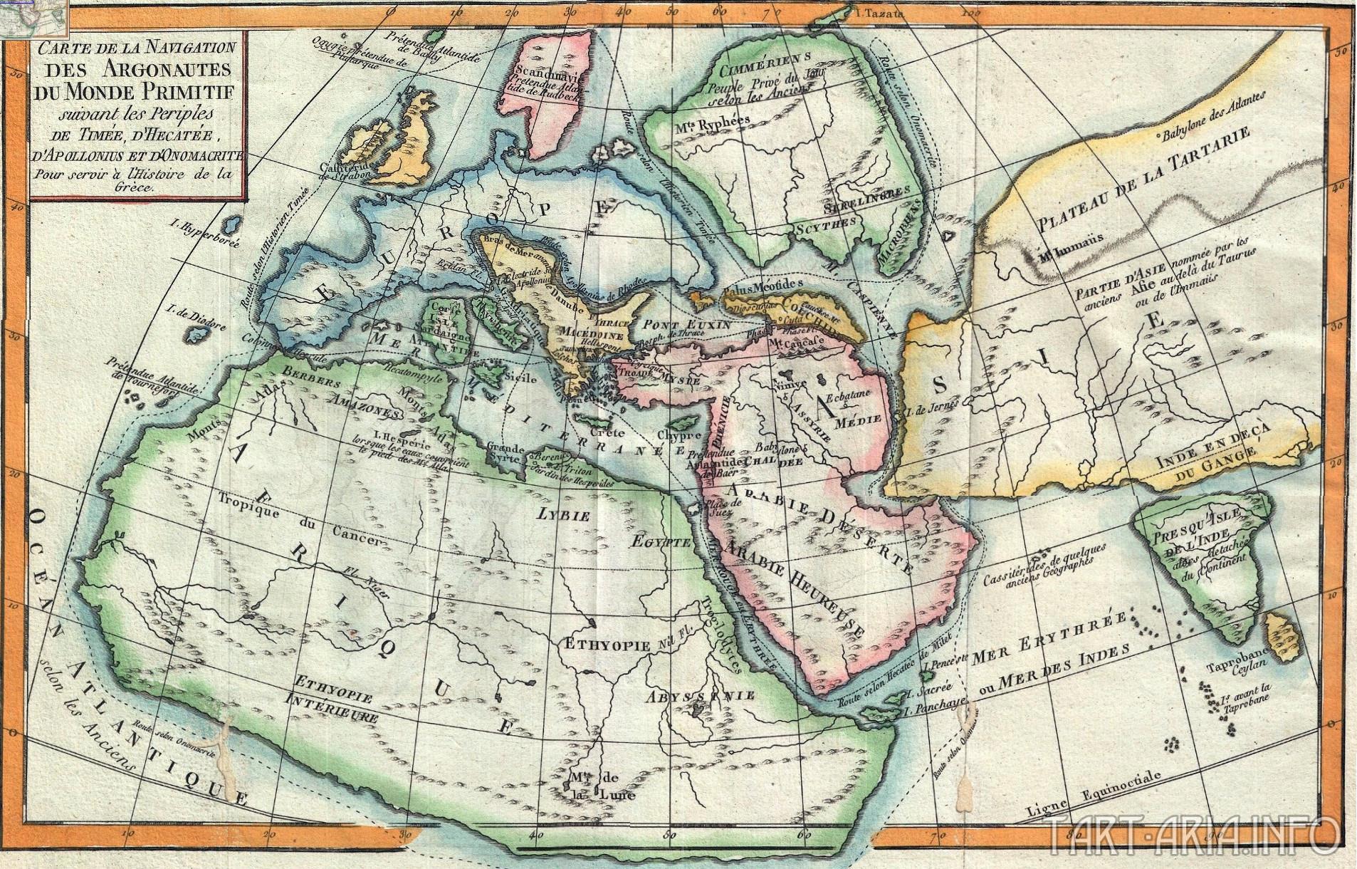 Так вот этот самый Делиль де Саль действительно славно погулял по Руси, аж до Сибири добрался. И он не просто гулял, а с научными целями. По результатам своих исследований он задумался о том, как жила Земля-матушка в старые времена… хотя не совсем даже и старые. И пришёл этот гражданин к выводу, что правы-таки были «источники» известные под брендами «Патрокл», «Эратосфен» и «Страбон» в том, что когда-то Каспий являлся частью Северного моря. Потом всё менялось, и Евразия постепенно приобрела современный вид. Мало того, что написал, он ещё и нарисовал четыре карты с изменениями географии континента во времени. Вот самая «фоменковская» из них: