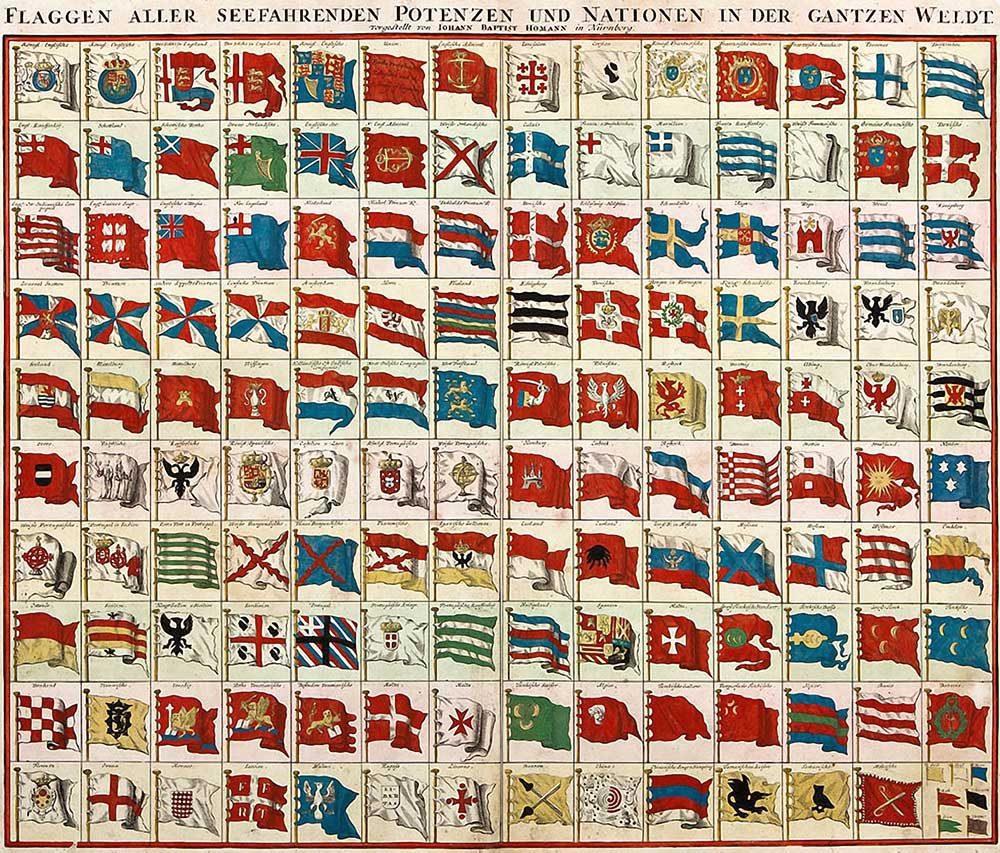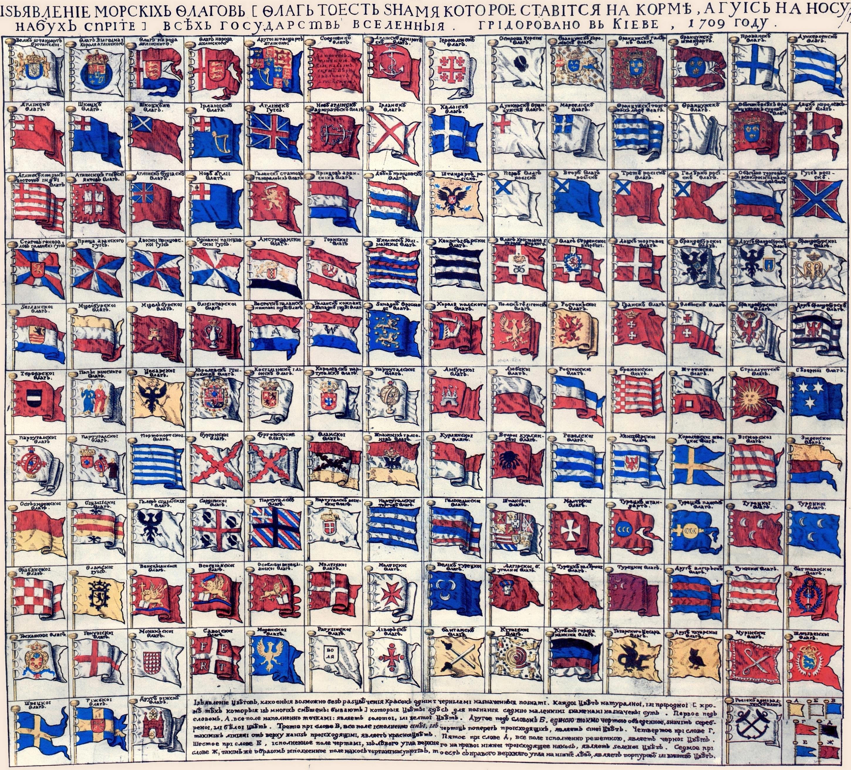Возьмём другой пример. Окунёмся, так сказать, в историю поглубже. Сколько мы наслушались от канонической «исторической науки» трёпа про то, что никакой Тартарии никогда не существовало, что старые карты – это подделки и их нужно «правильно понимать», и то, что там написано «географическое понятие», а не название страны и прочая пурга. Хотя дело касалось не только карт. Вот, например, государственные стяги, которые гордо развивались над кораблями и прочими важными штуками. Целая колода, так сказать, напечатанная в Киеве, в 1709 году: