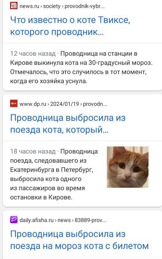 У меня не укладывается в голове , как можно быть жестоким с животным, выкинуть на 30° мороз ? О чём думала безмозглая курица, живодёрка проводница поезда выкидывая на мороз домашнего кота ? Отговорки что тот зашёл с улицы, это бред , у него были сухие не мокрые лапы. Я бы эту тварь уволил с работы и засудил. К сожелению у нас слишком мягкие законы к таким нарушителям жестокого обращения с животными.