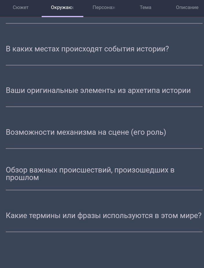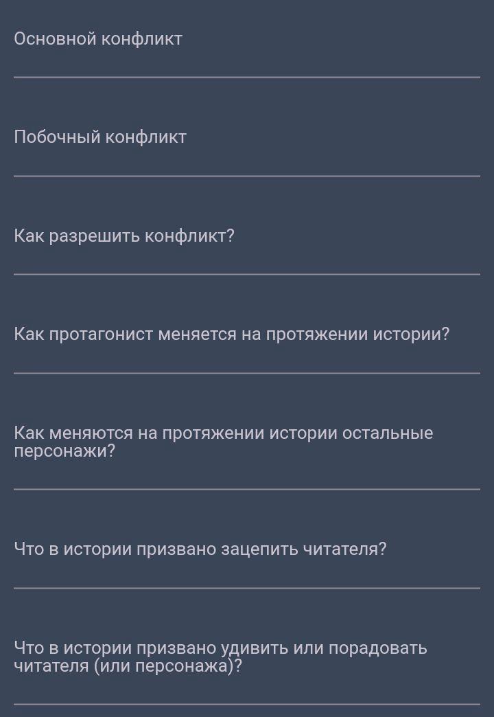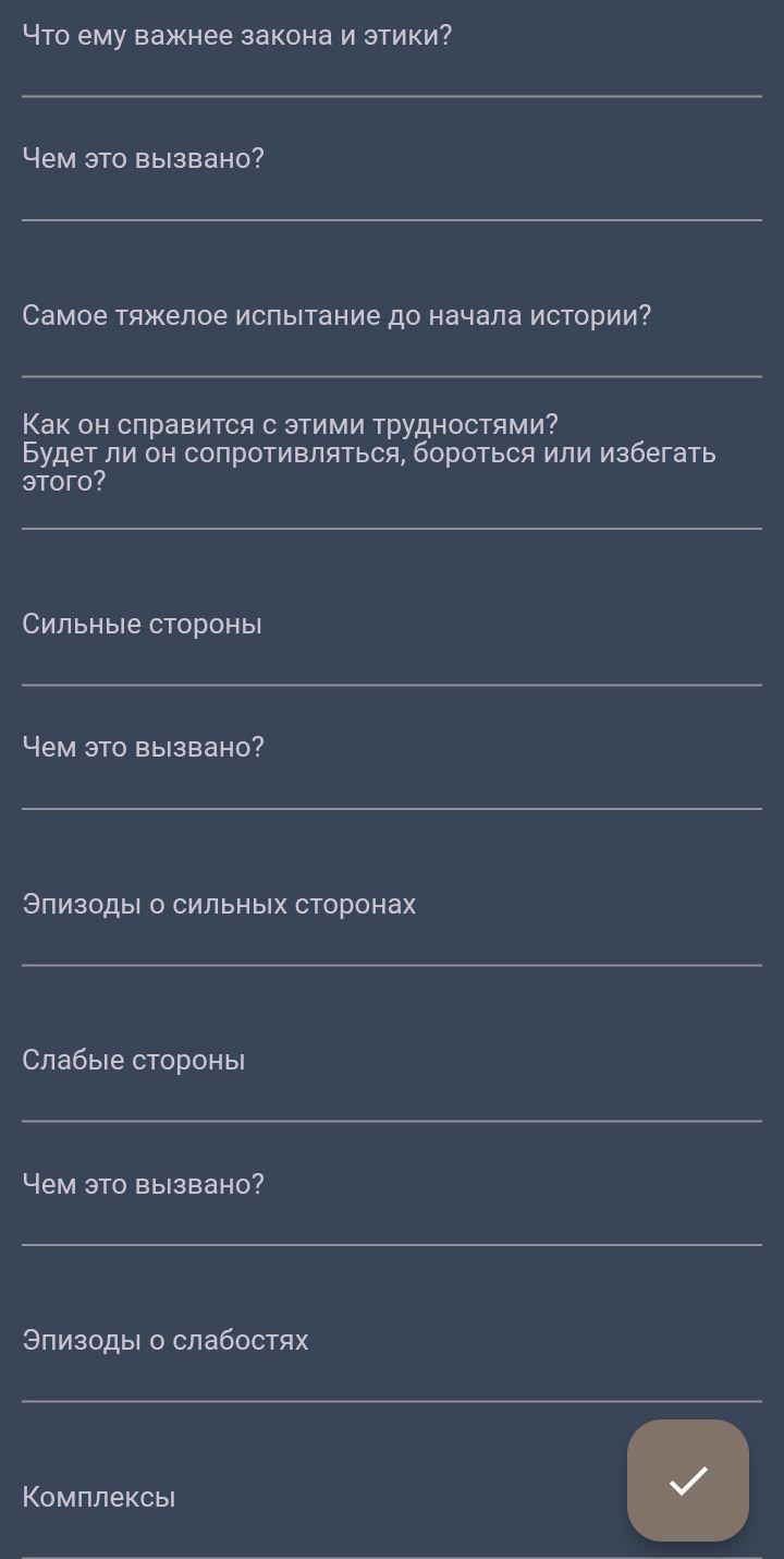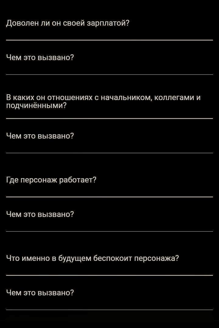 Вопросы в каждом пункте очень похожи на некое такое досье разведчика. Но очень важно понимать что за историю ты создаёшь и пишешь.