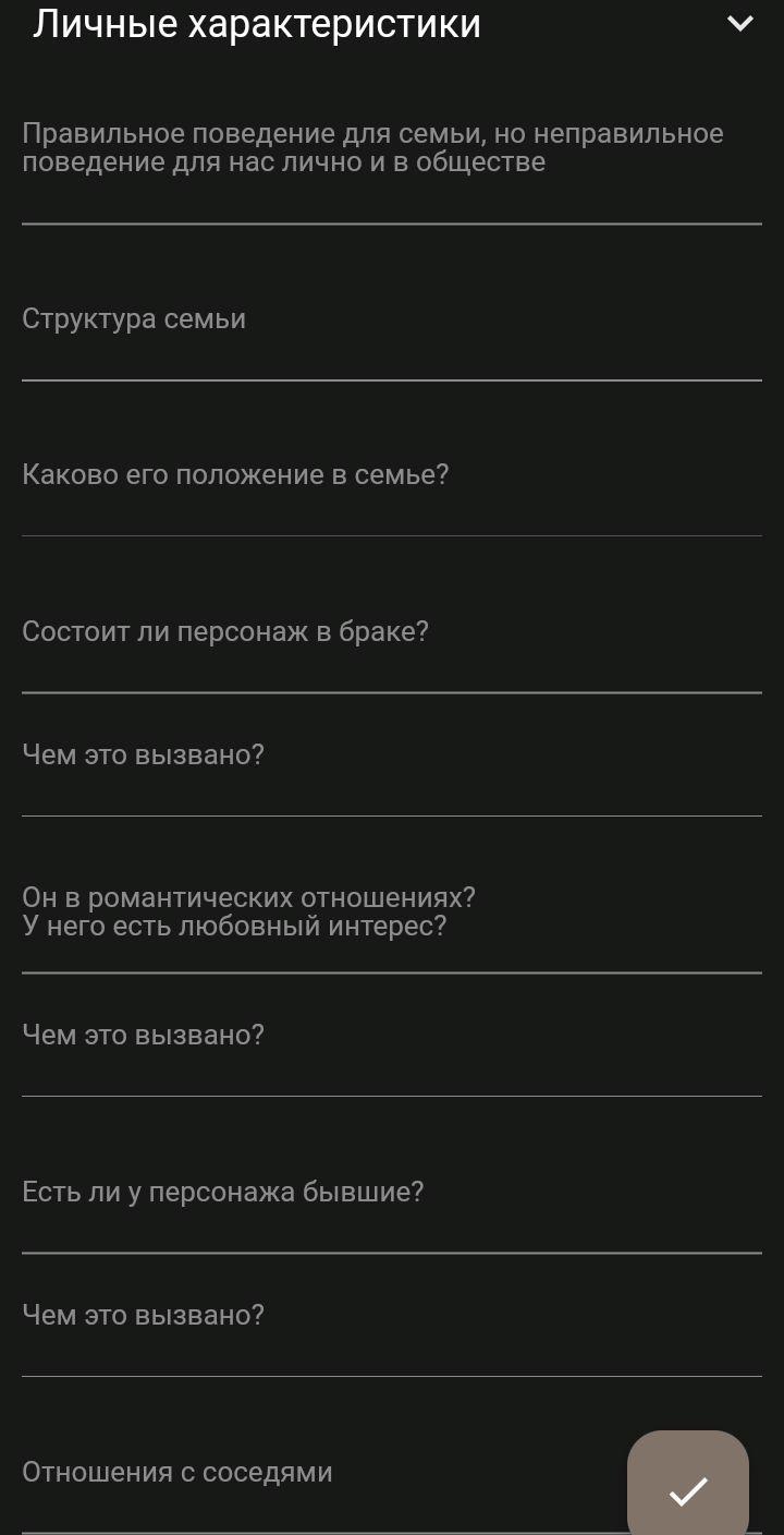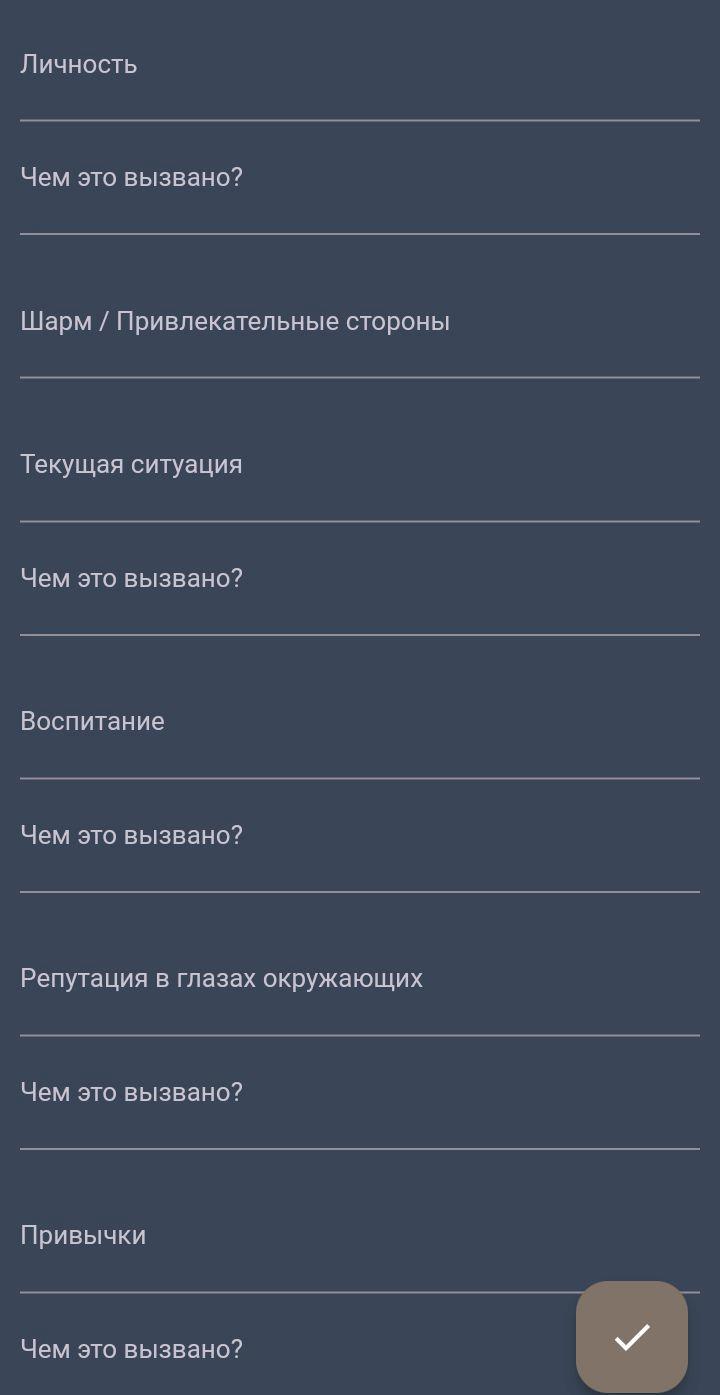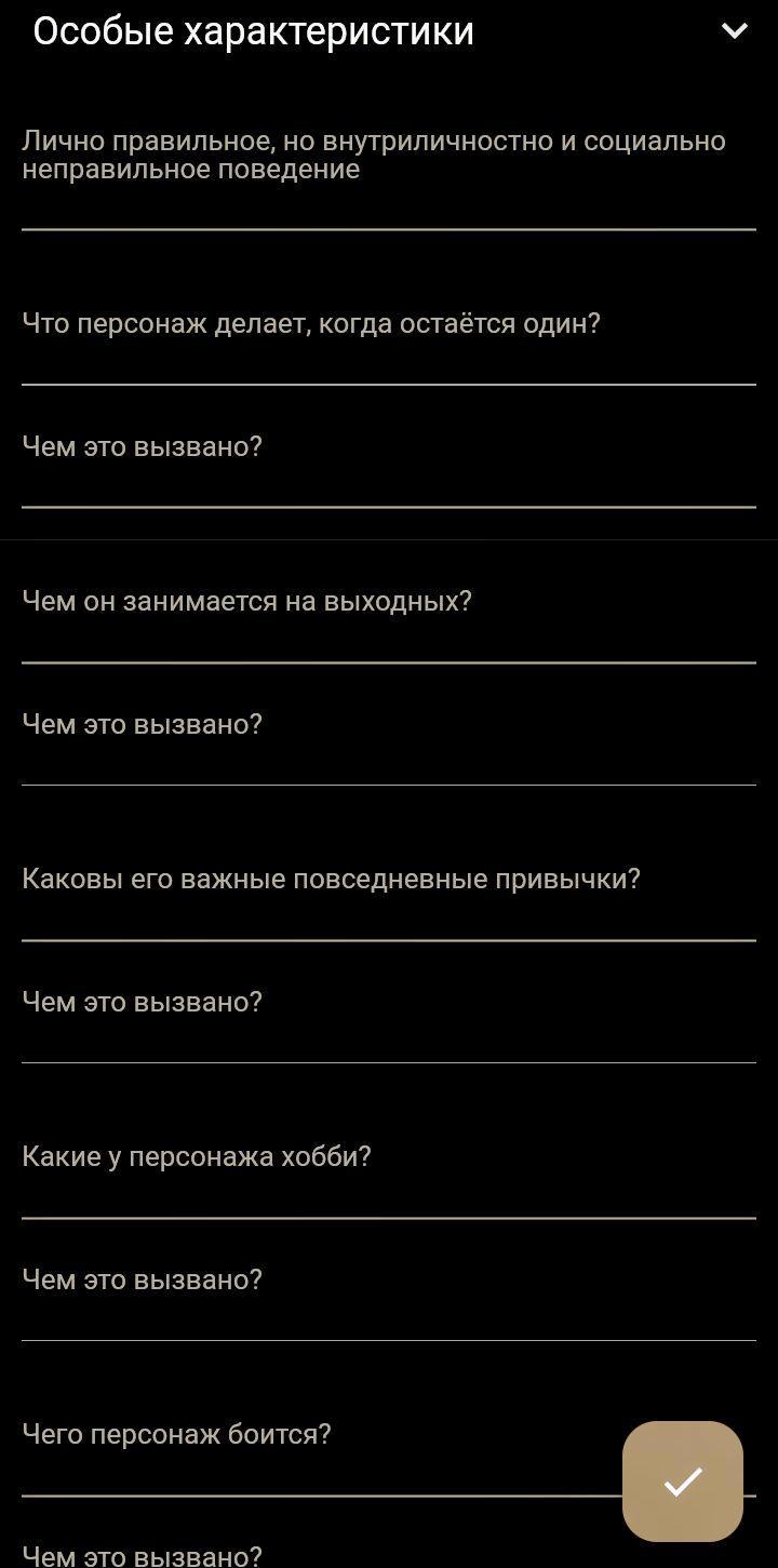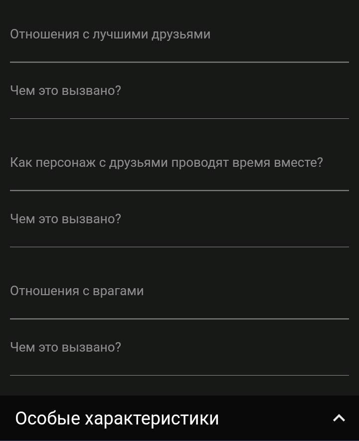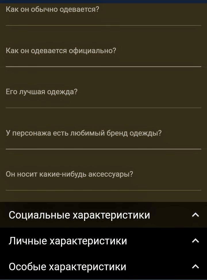 Как вы сами видите пунктов для заполнения анкеты персонажа очень много. Помимо основных есть и дополнительные: