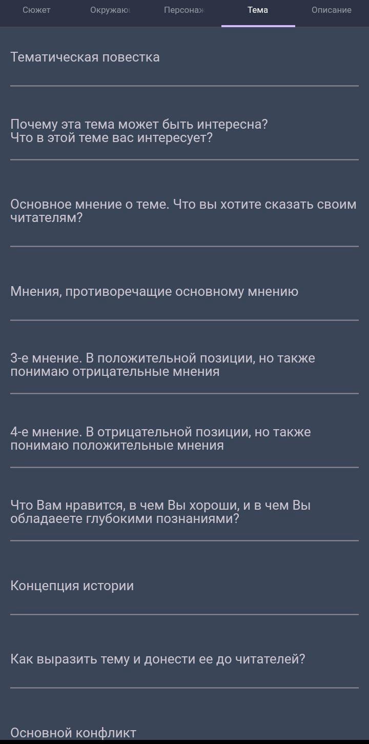 Однако и это ещё не всё! Помимо интересной фишки в виде создания схемы взаимоотношений персонажей и помощи от нейросети, есть такой важный пункт как "Тема":