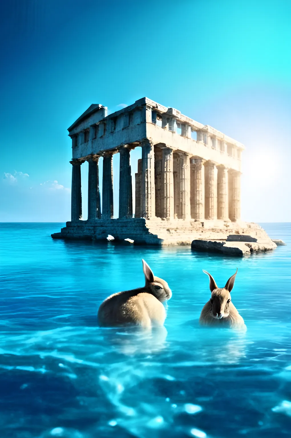 Итак, запрос для нейросети: древнегреческий храм, море, солнечные зайчики на воде.