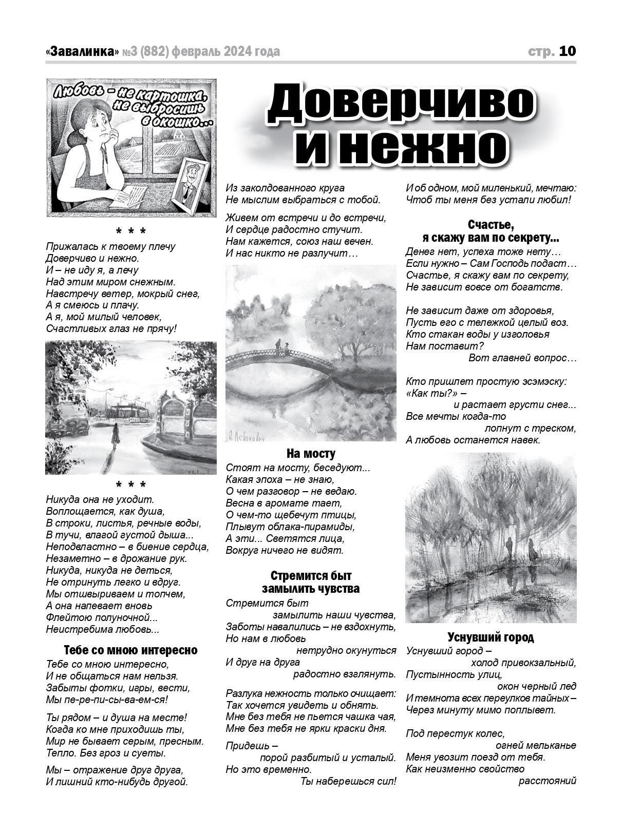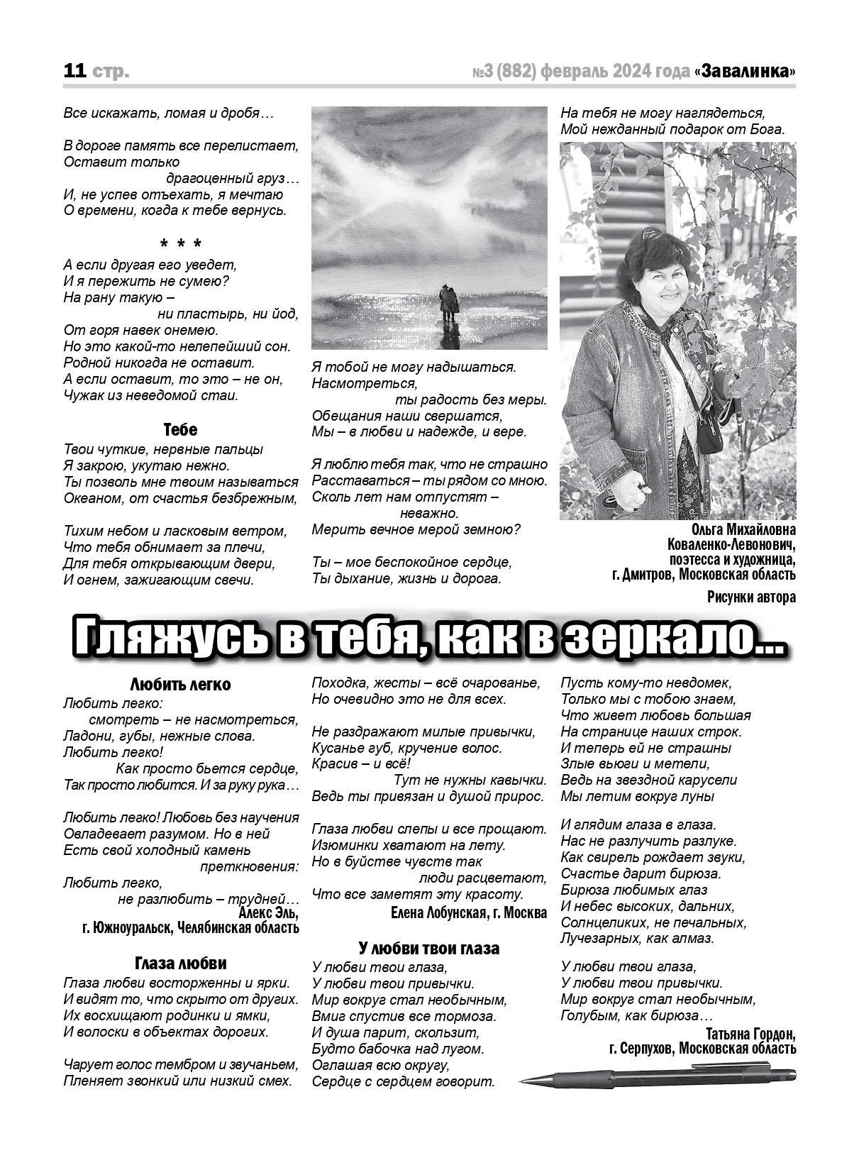 Автор: Ольга ЛевоновичПришло письмо от Ольги Пословиной, главного редактора журнала "Завалинка". Почти две страницы отвели под мои стихотворения и акварели. Интересно, что и в чёрно-белом варианте акварели хорошо смотрятся, подходящие иллюстрации получились.