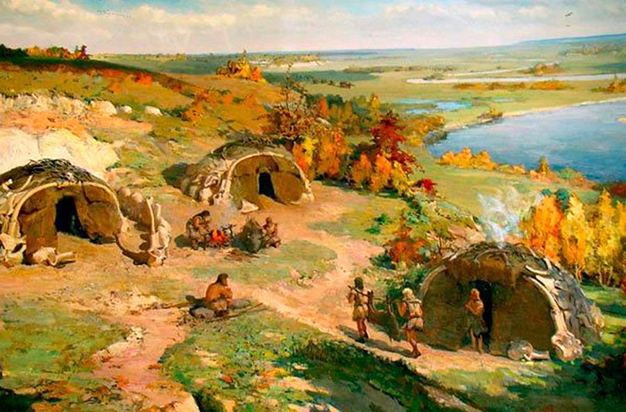 Несмотря на годы, прошедшие со времён раскопок, споры об особенностях жизни этих людей не утихают. Работа продолжается. И даже общественности забыть про всё это не дают. Совсем недавно, например, в Киеве прошла выставка «Искусство охотников на мамонтов» (ага, а вы думали, что они только выборами заняты?..), на которой были показаны подлинные находки из Мезина тоже. Вот на этом сайтике, например — https://kyiv.web2ua.com/v-kieve-predstavleny-originaly-pamjatnikov-iskusstva-jepohi-paleolita-1593/ Показать и рассказать есть что. Выяснили, что это было серьёзное поселение с организованным бытом, привольно разместившееся на площади около 1200 квадратных метров. Кое-что из построенного и найденного было похоже на Костёнки. В описаниях очень много буков, поэтому я поискал и нашёл картинку-реконструкцию этого поселения. Так куда нагляднее: