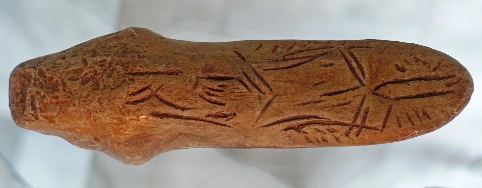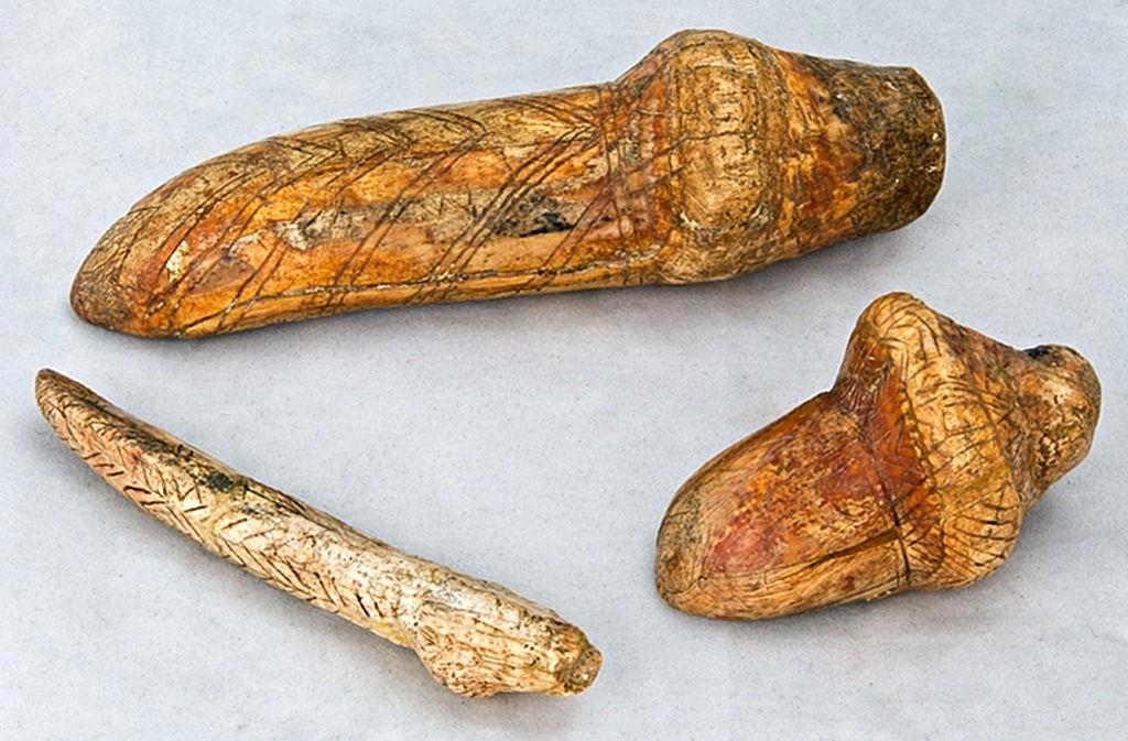Материал у них один — кости мамонта. Размеры, как видите, и соотношения размеров у всех разные, хотя общая конфигурация сходная. Все эти предметы имеют следы дополнительной обработки. То есть они как-то ещё «украшены» какими-то резами, штрихами, пропилами. Вот здесь этих видно ещё лучше. И опять на них штрихи и резы. Ясно, что это всё совсем не просто так. Какая-то система в этих резах явно просматривается. Вот один такой предмет поближе и с двух сторон: