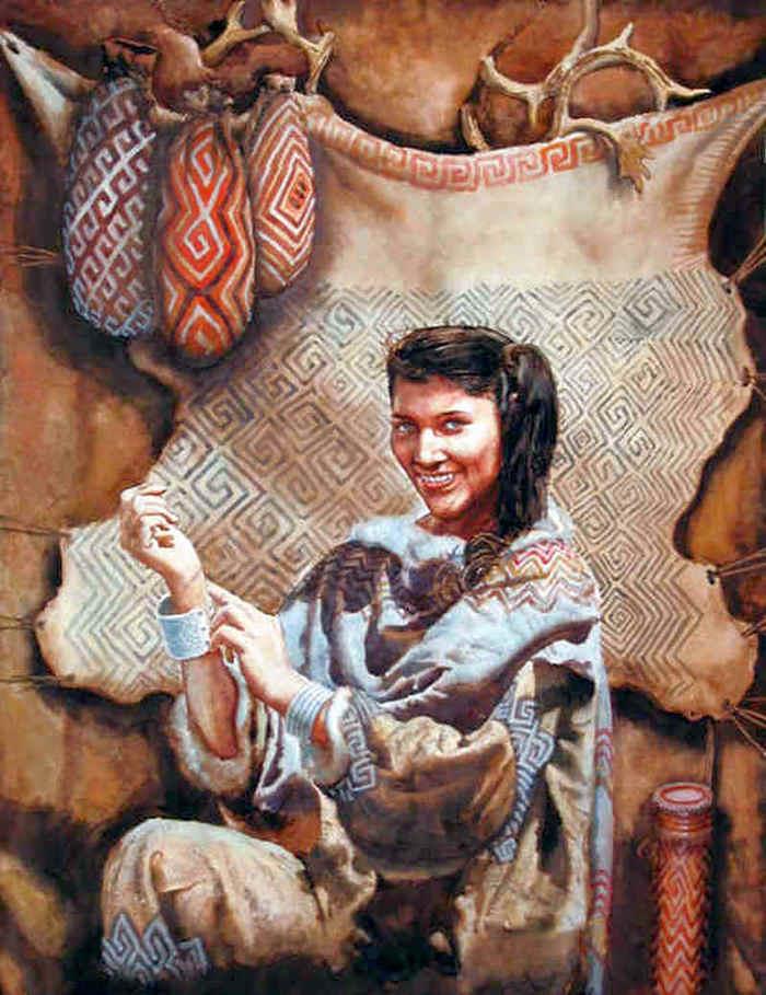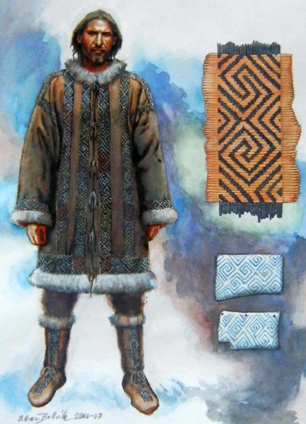 Получилось, на мой взгляд довольно красиво, хотя некоторые вопросы остались. Например, мужское полупальто с узорчиками. Если нашим реконструкторам в работе над восстановлением одежды жителей Сунгиря помогли многочисленные «стразики» из кости мамонта, которыми были расшиты костюмы древних, то откуда взялись детали одежды жителей древнеМезино не совсем понятно. У меня возникло подозрение, что художников вдохновили костюмы современных чукчей, эвенков и прочих жителей Севера. Геометрические узоры же имеют другую основу. И вот здесь нужно подробнее...