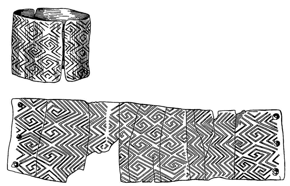 Если посмотрите внимательно на картинку-реконструкцию, то увидите на правой руке женщины именно этот браслет. Второй браслет тоже красивый и интересный, но правый значительно загадочнее. На фотографии хорошо видно, что меандровый узор на браслете чередуется с зигзагами. Вот рисунок развёртки этого браслета: