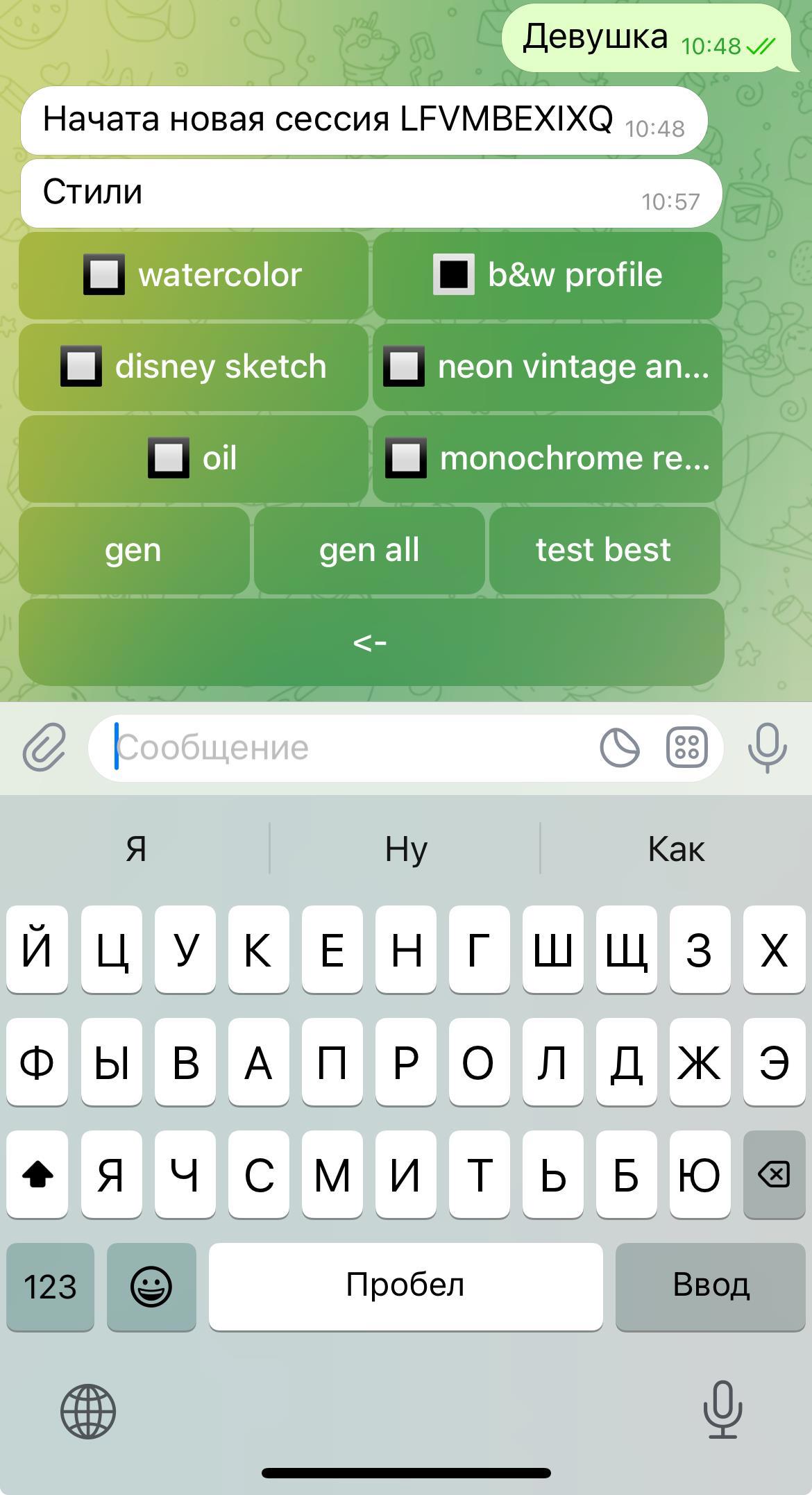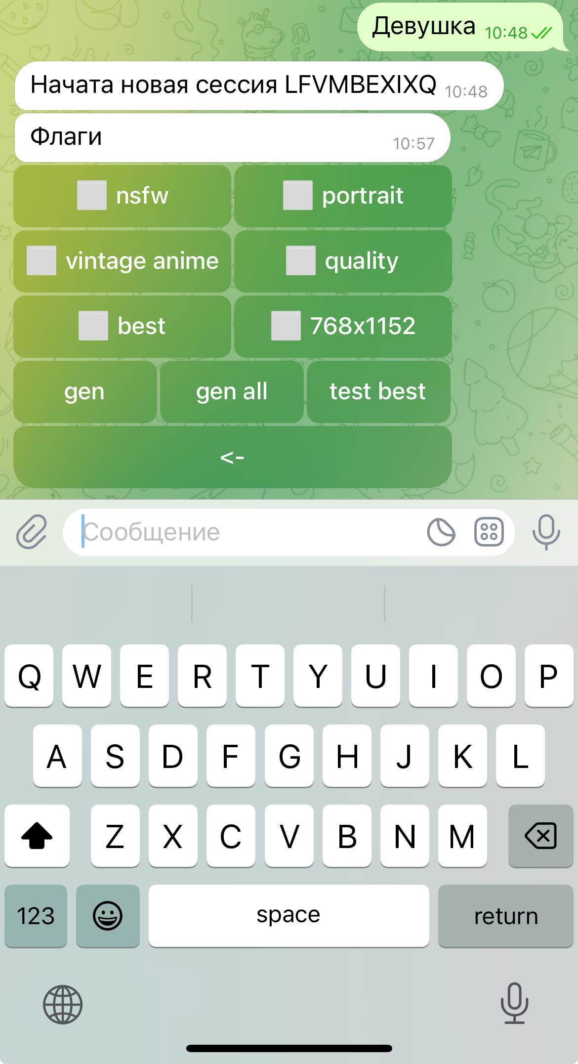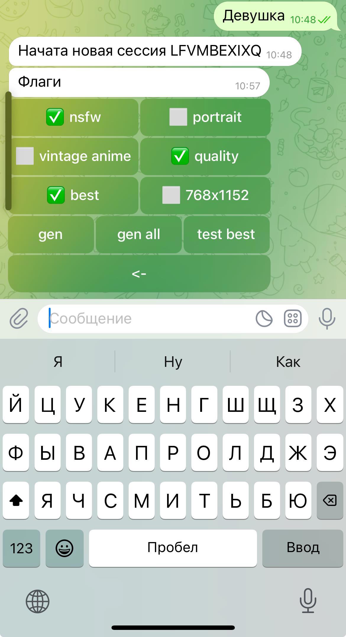 В текущей реализации телеграмма из интерфейсных фишек есть только кнопки, и нет чекбоксов. А между прочим я давно задумывался о чем-то «таком этаком включательно-выключательном» для своего бота, чтобы можно было легко докидывать и также легко убирать стили, флаги, параметры генерации, без муторного ручного редактирования или без отката промпта на начальный вариант.