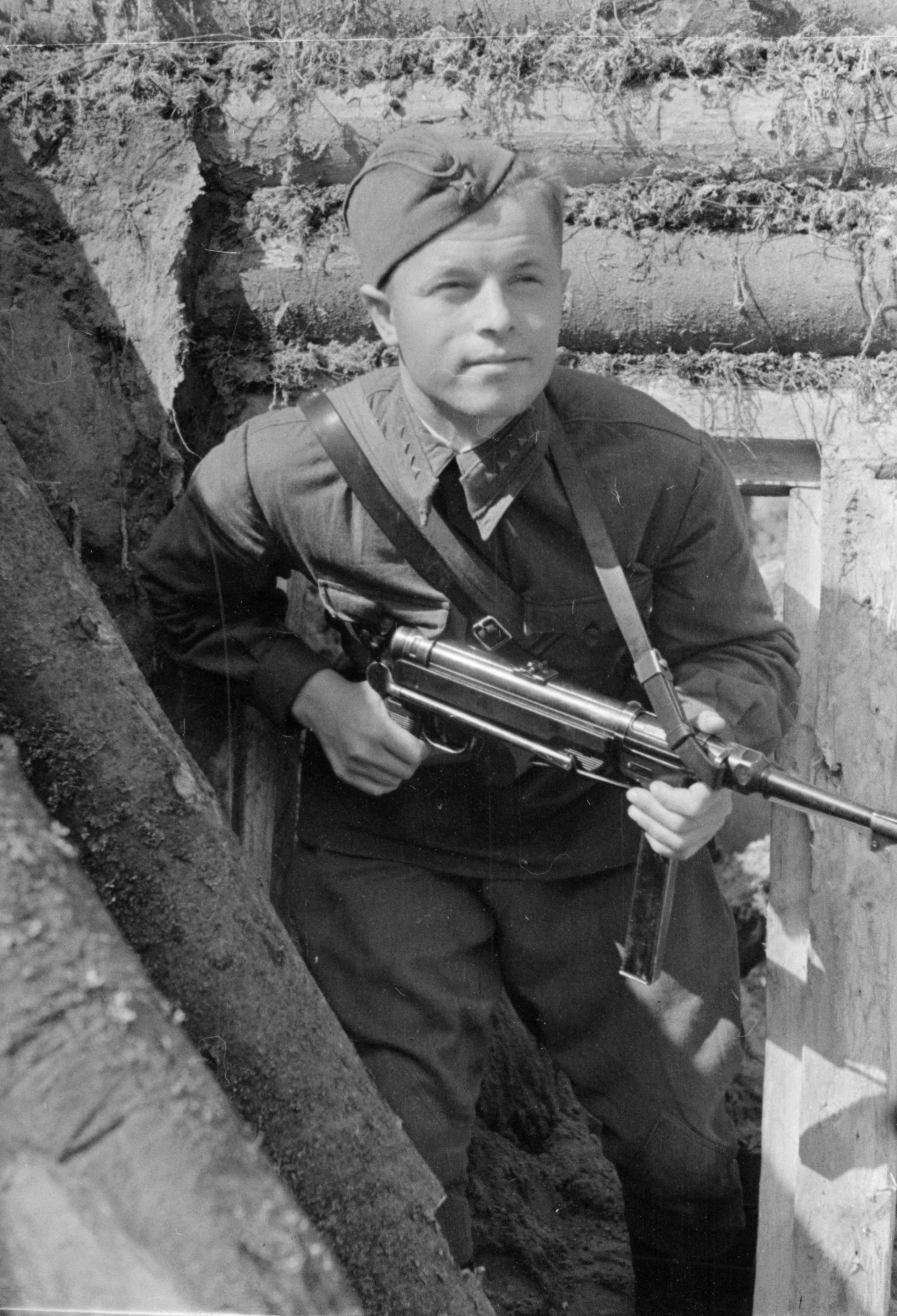 Разумеется, в годы войны особо пристальное внимание уделялось оружию врага. До войны на полигоне уже изучали немецкие пистолеты-пулеметы, в частности внимательному разбору подверглись "Шмайссер 18/28" и"Бергман МП-34". После 22 июня 1941 года с фронта стали приходить многочисленные рапорты о "немецких автоматчиках", основным оружием которых, как считалось, былMaschinenpistole 40, во многих источниках ошибочно именуемый "шмайссером", хотя он был разработан конструкторами Erfurter Maschinenfabrik (ERMA) без участия Хьюго Шмайсера. На самом деле в германской армии пистолет-пулемет считался скорее второстепенным оружием, которое выдавалось экипажам боевой техники, низовому командному составу, десантникам и так далее. Тем не менее, образ немецкого автоматчика с закатанными рукавами поливающего "от живота" из "шмайссера" благополучно пережил войну и благодаря советскому кинематографу стал массовым и узнаваемым всеми жителями бывшего СССР.