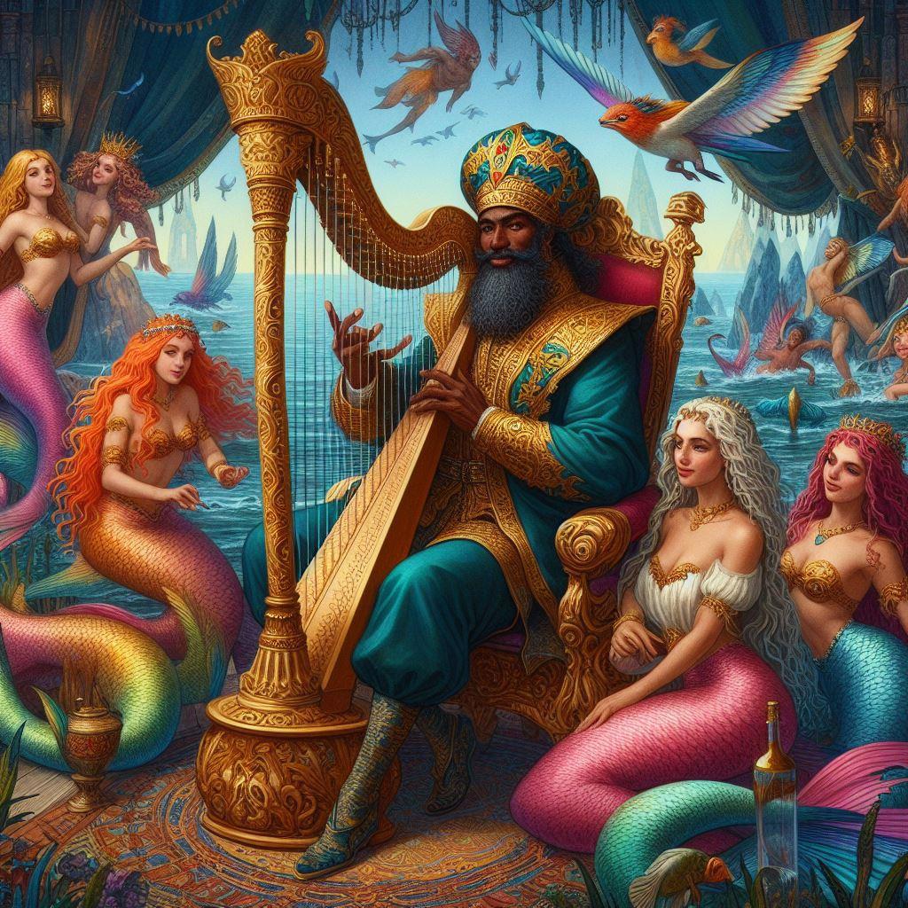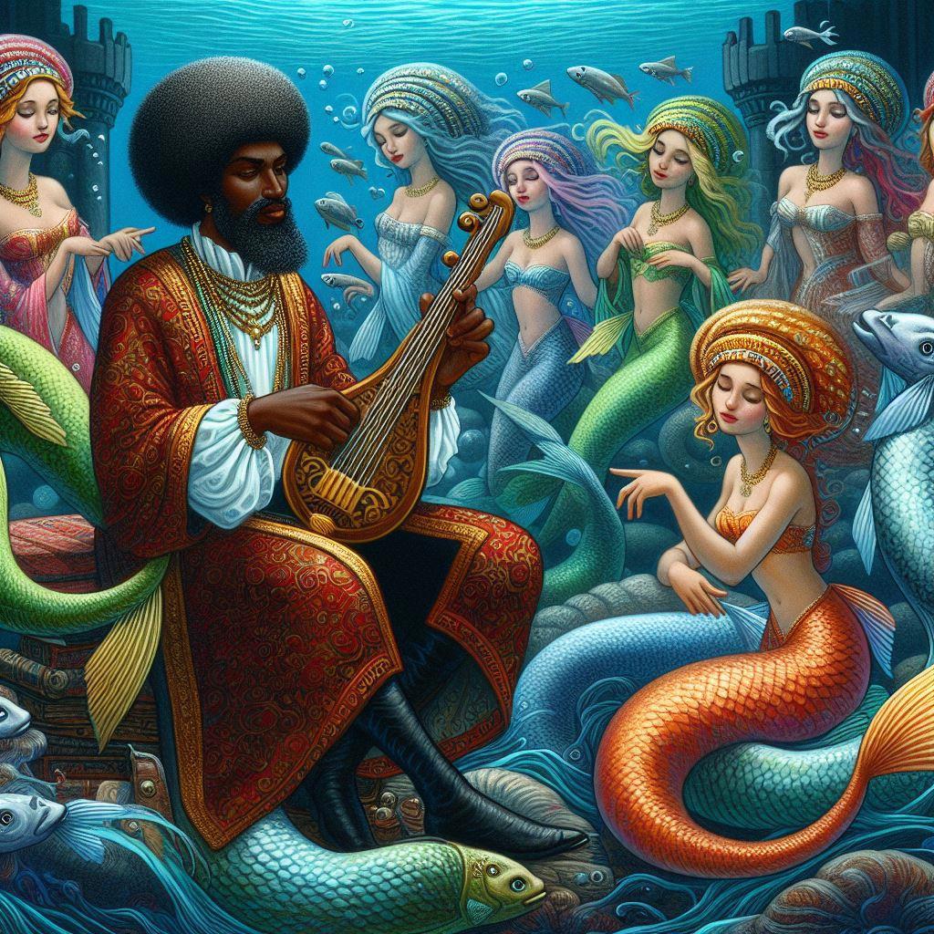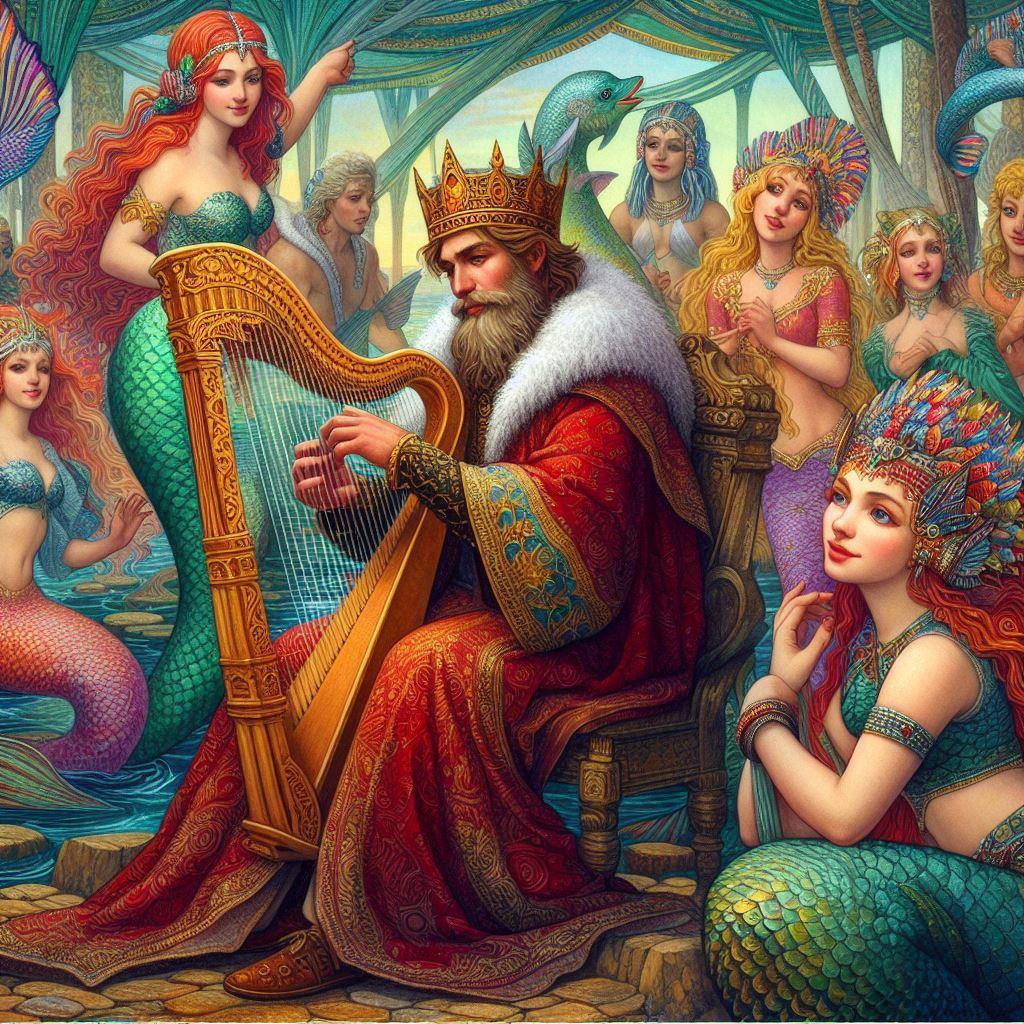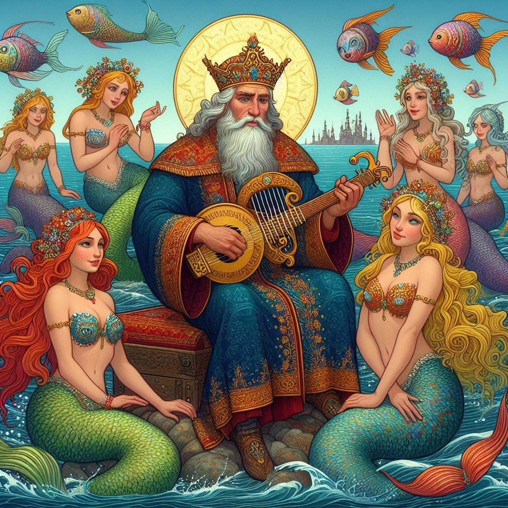 Книгу я в сети не нашел, потому что не помню ни автора иллюстраций, ни издательства, хотя тиражи были огромные. Ее еще потом несколько раз переиздавали. И поэтому решил сгенерировать подобное изображение. Насчет русалок ничего сказать не могу, ИИ хорошо их нарисовал. А вот вместо богатого гостя Садко, что только не придумал, кроме самого купца, хотя я трижды менял описание и он сам мне даже былину эту процитировал. Но изобразить не смог.