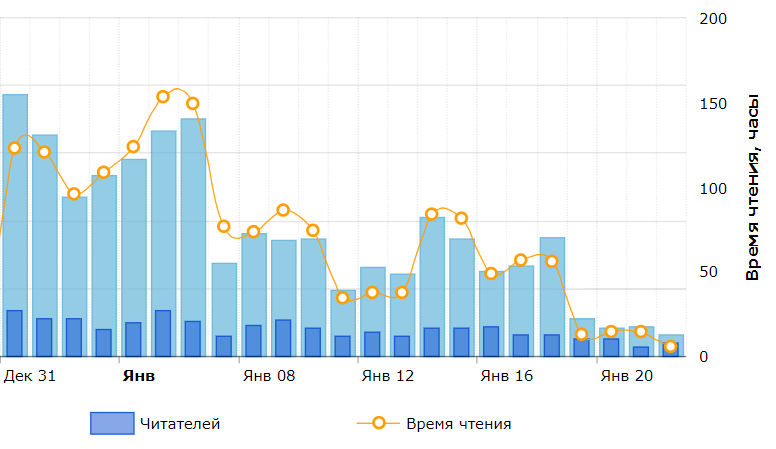 Безо всякой рекламы "Неждану" читали 120-150ч в день, потом праздники закончились показатели стали падать, но не так, чтобы совсем. Требования для коммерческого статуса были выполнены, статус получен...