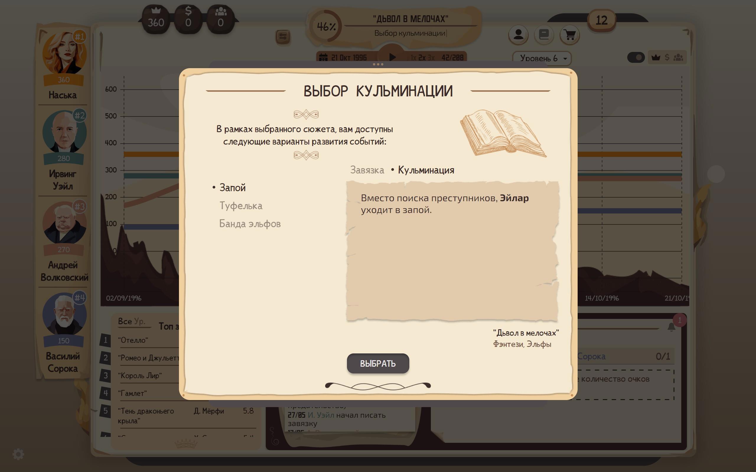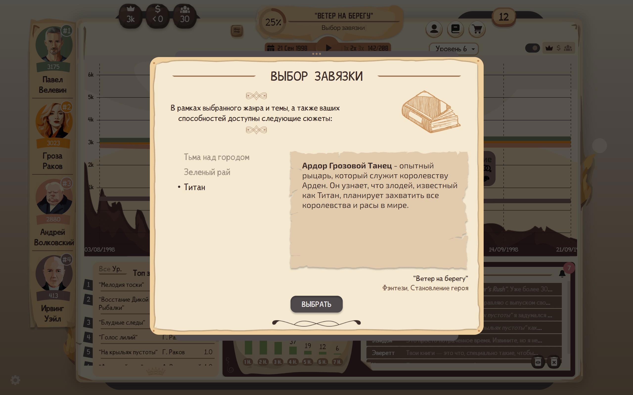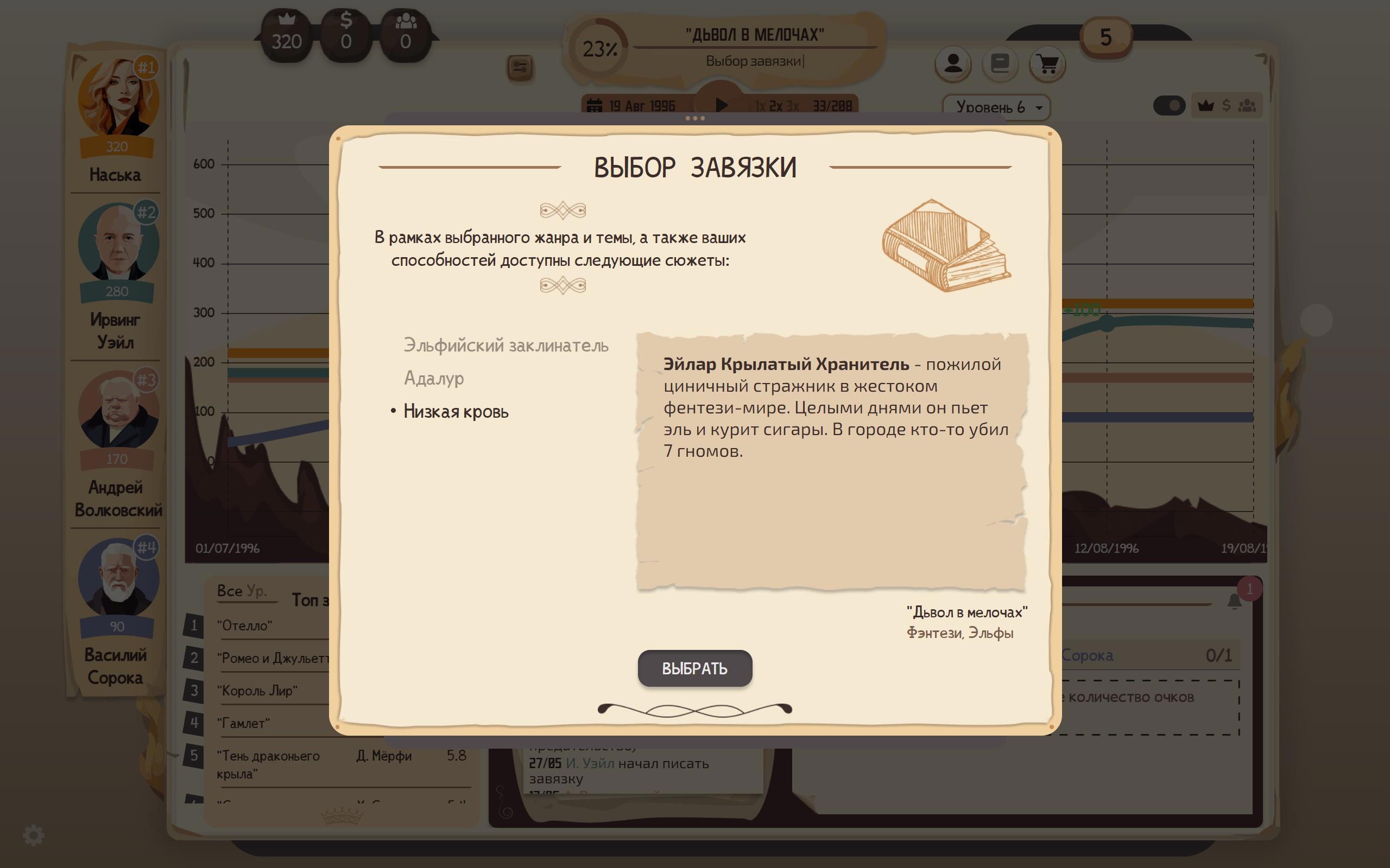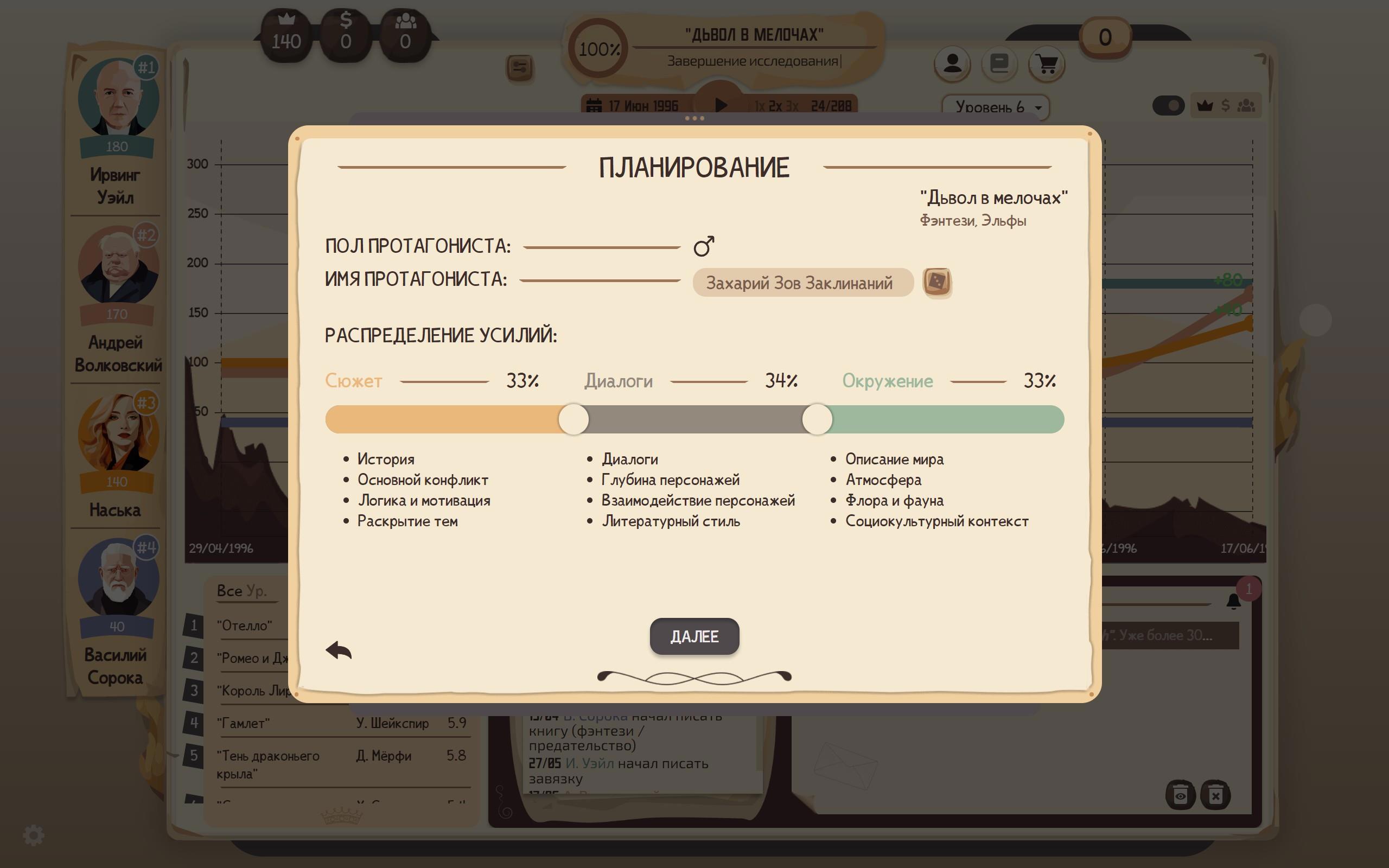 Затем Вам дают возможность наскоро изучить рынок по выбранному Вами жанру (если Вы тупой, исследование рынка может не принести результатов. Я из 5 раз 1 раз была тупой). Затем необходимо приступить к планированию романа. А именно - к созданию протагониста и выбору завязки. Имя Вы можете написать и собственно-вымышленное, но если вдруг с фантазией беда, то местный ИИ Вам подсобит. Например так: