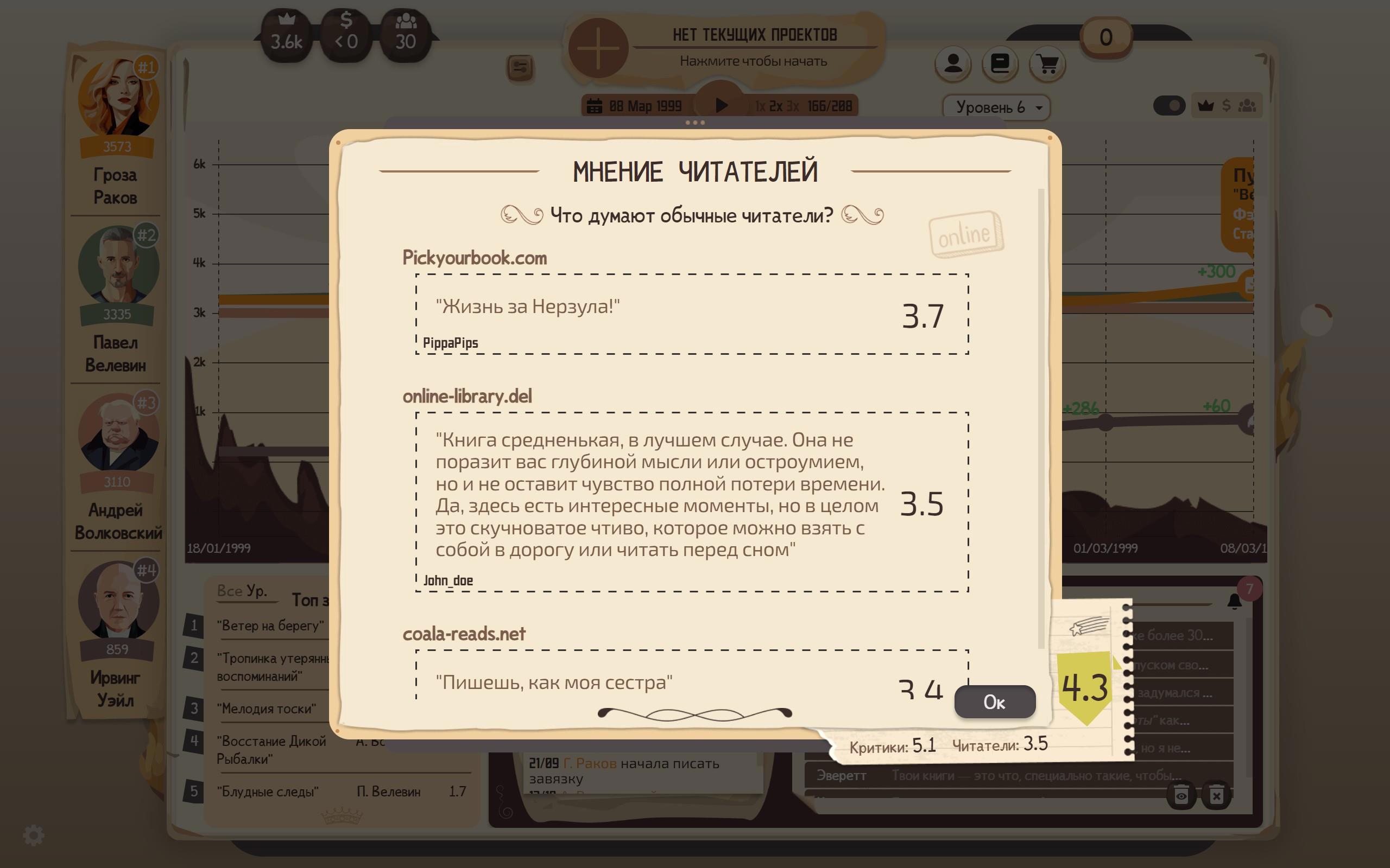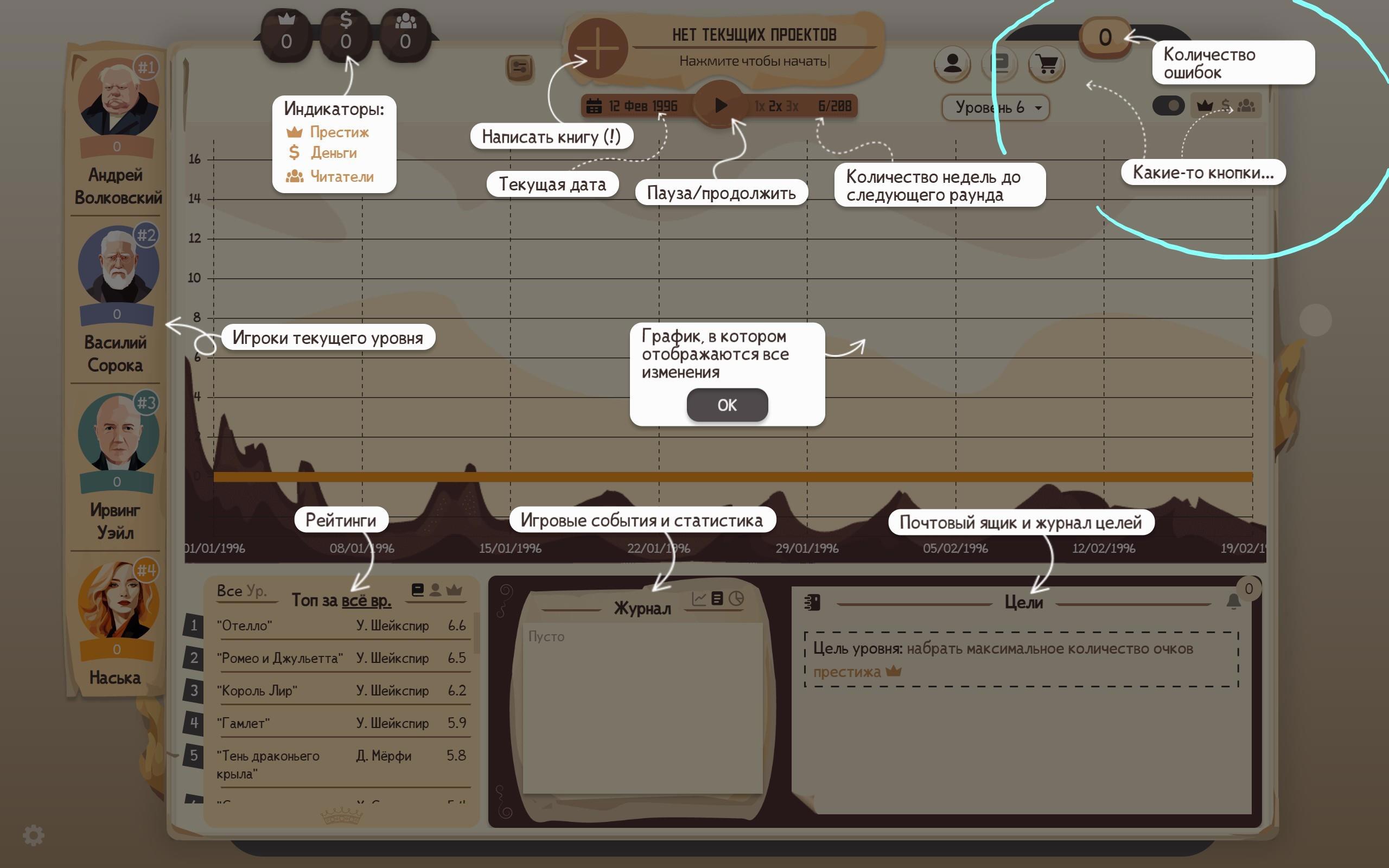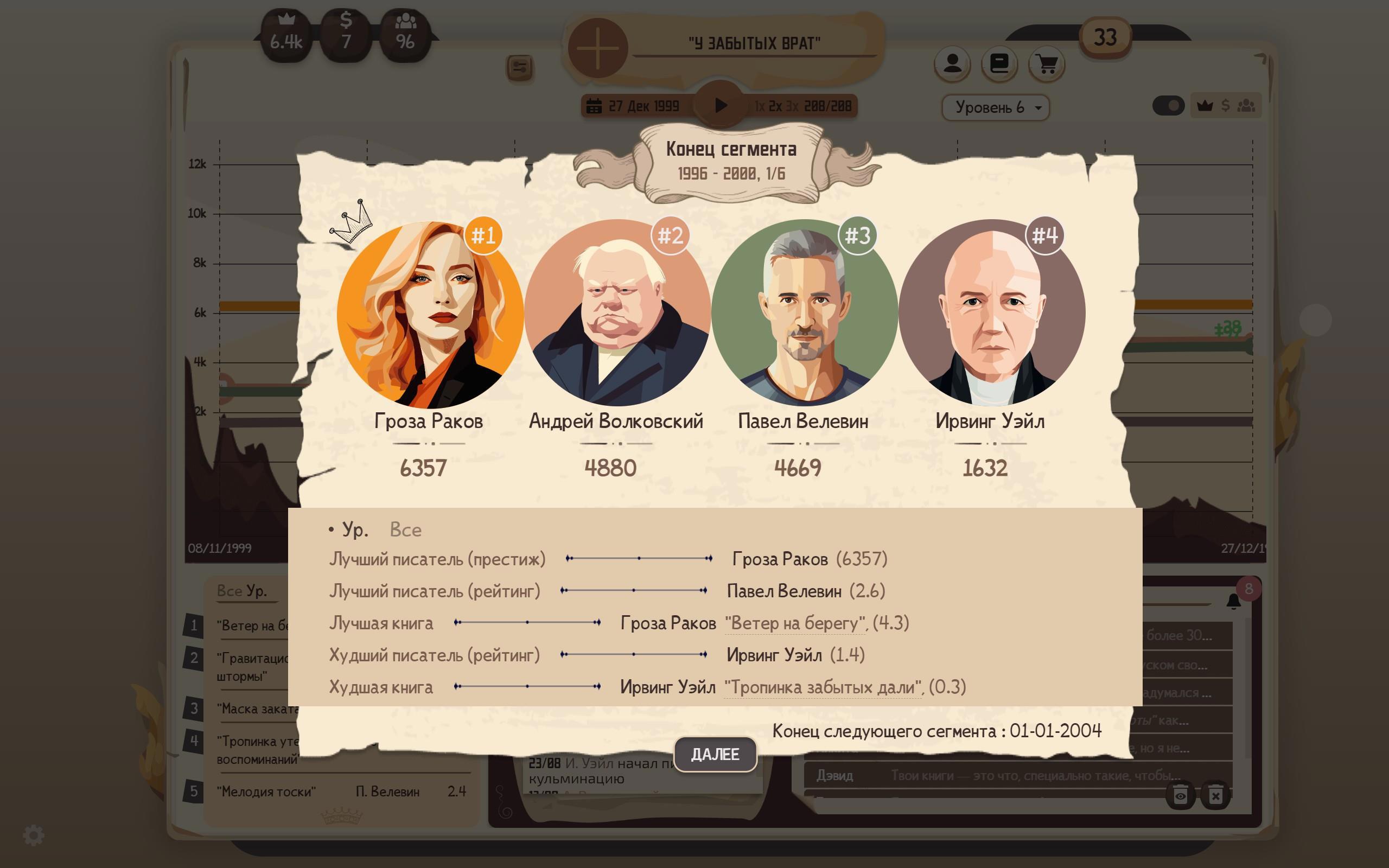 "24 писателя, вы один из них. Главная цель - стать лучшим писателем в мире. Пишите книги, создавайте персонажей, выбирайте концовки, объединяйтесь с соперниками, отвечайте на письма читателей и не дайте другим писателям одержать вашу победу."
