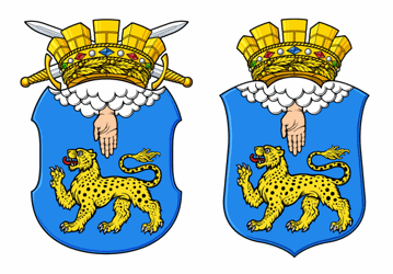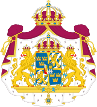 Сразу видны два льва, держащие гербовой щит. Что можно сказать об этих шведских хищниках? Королевские (коронованные) восставшие львы, смотрящие в стороны (на Запад и Восток), если помните, такие львы называются стерегущими. Они вооружены: языки красные, когти по цвету отличаются от "золотого" тела львов. Если вглядеться, то можно увидеть ещё одну их особенность - на их шеях висят христианские кресты, т.е. эти хищники являются не только защитниками государство, но и хранителями христианской веры. На самом щите запечатлён ещё один лев, у него даже имеется собственное название.