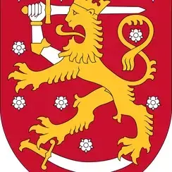 Коронованный золотой лев в червлёном поле, правая передняя лапа заменена рукой в доспехах, держащей серебряный меч с золотой рукоятью. Лев попирает задними лапами серебряную московскую саблю с золотой рукоятью. Щит обременён 9 серебряными розетками (по числу исторических частей Финляндии). Конечно, Финляндия никогда не была независимым королевством, тем более в Средневековье. Официально используется только с 1978, хотя впервые появился около 1580 года на статуе шведского короля Густава I Вазы, установленной в готическом соборе шведского города Уппсала.
