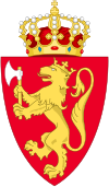 Золотой коронованный восстающий лев, вооружённый - красный язык и секира в лапах, на красном фоне. Впервые лев появился на гербе норвежских королей в конце XII — начале XIII веков. Короли Хокон Хоконссон и его сын Магнус Законодатель имели изображение льва на своих щитах. А Эйрик Магнуссон, сын Магнуса Законодателя, добавил ко льву корону и боевой топор. С тех пор золотой коронованный лев на червленом поле, держащий в передний лапах серебряную секиру с золотой рукоятью, является неизменным гербом Норвегии, испытав на себе, однако, все изменения в геральдической моде. Лев в геральдике является символом силы, а боевой топор — секира — не только излюбленное оружие древних норвежцев, но и, прежде всего, — атрибут небесного покровителя Норвегии — Святого Олава. Согласно «Саге об Олаве Святом», рана, нанесенная именно секирой послужила причиной смерти Олава.