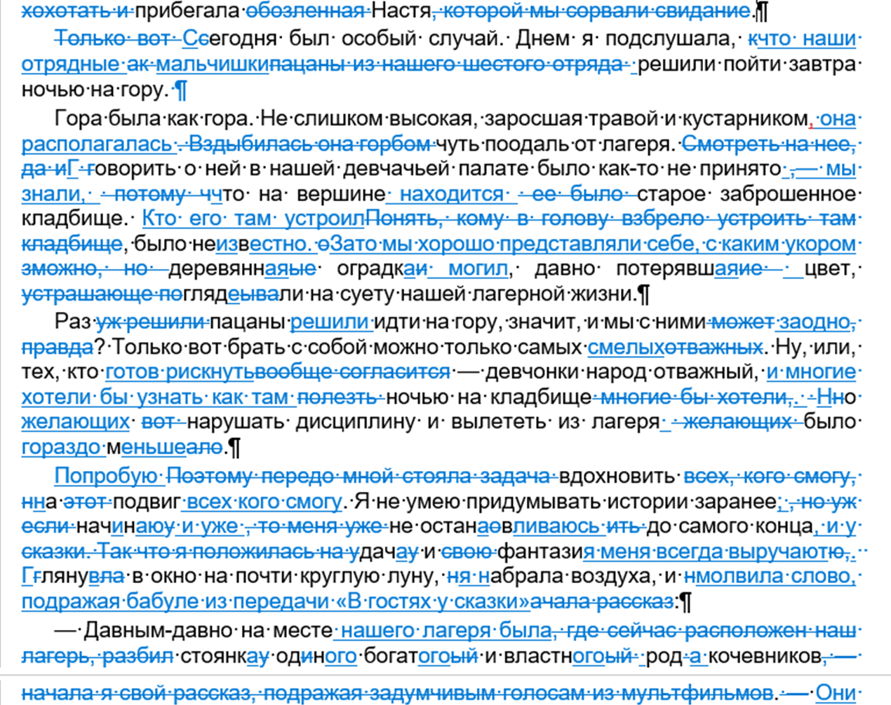 Длинных правок не буду показывать — это, наверное, скучно. Просто дам кусочек лит.редактуры одного из рассказов "На горе" о пионерском лагере (обычно не сохраняю черновики, а тут, очень удачно, выложила рассказ у себя в группе, а потом отредактировала — так что Ворд помог сравнением файлов: дописанное подчеркнуто синим, а удаленное вычеркнуто).