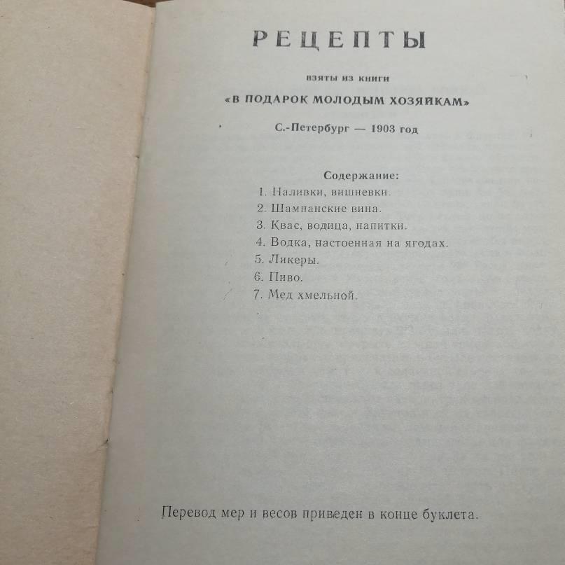 На 16 ведер воды положить 20 фунтов хорошего мёда и 9 золотников корицы, кипятить в котле, пока не останется 3 ведра, потом снять с огня, дать остыть, как парное молоко, тогда взять шестикопеечную французскую булку, обрезать кругом, мякоть обмазать хорошенько самыми лучшими дрожжами, опустить в котёл, положив туда же небольшую щепотку хмелю (сколько можно взять тремя пальцами), если будет бродить слишком слабо, то можно прибавить ещё ложки две дрожжей, когда же брожение будет достаточное в продолжении часа, то вынуть булку, процедить, влить в хороший, очень крепкий бочонок, положа туда следующих духов, каждые порознь, завязанные в кисейные тряпочки, а именно: кардамону 9 золотников, фиалкового корня кусочками 9 золотников, осетрового клею 1/4 фунта, закупорить втулку в бочке, как можно крепче, поставить на лёд поглубже на 12 суток, потом разлить в бутылки, закупорить, засмолить и держать на леднике, употреблять можно через 2 месяца.
