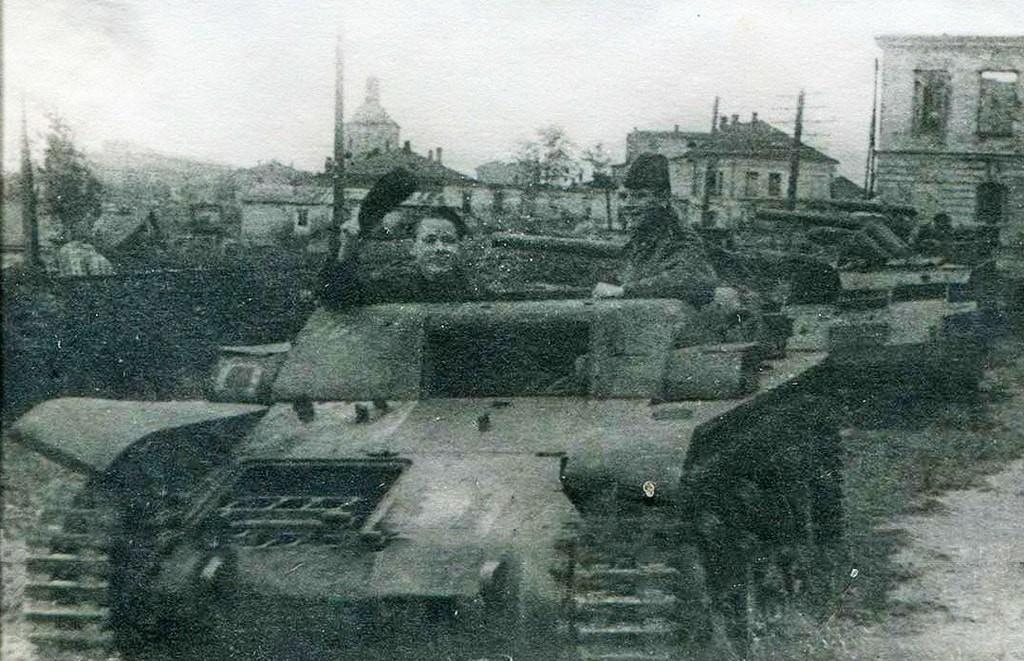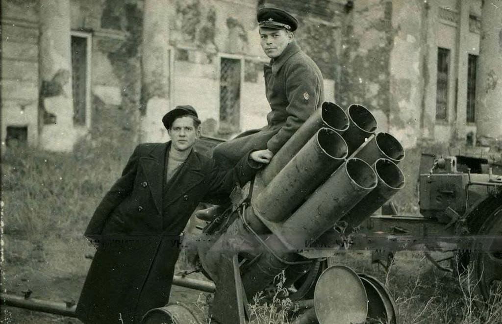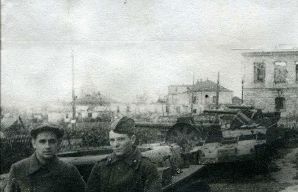 Слева — разведчик Ханифий Мустакеевич Жамалейдинов (убит 24.03.1943), справа — начальник разведки 1-го дивизиона лейтенант Иван Романович Блохин. За бои под Воронежем награждён медалью «За отвагу». Погиб в бою 23.07.1944, возглавляя атаку своего подразделения. Посмертно представлялся к званию Героя Советского Союза.