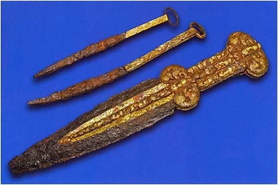 Этот экземпляр изготовлен из железа и инкрустирован золотом. В Казахстане и Минусинской котловине попадаются акинаки, целиком изготовленные из бронзы. Но это уже анахронизм. В основном мы видим либо железные, либо биметаллические акинаки, у которых из бронзы изготовлена только рукоять. Следует уточнить, что скифские мастера ковали акинаки из стали, а гарду приваривали методом холодной сварки.