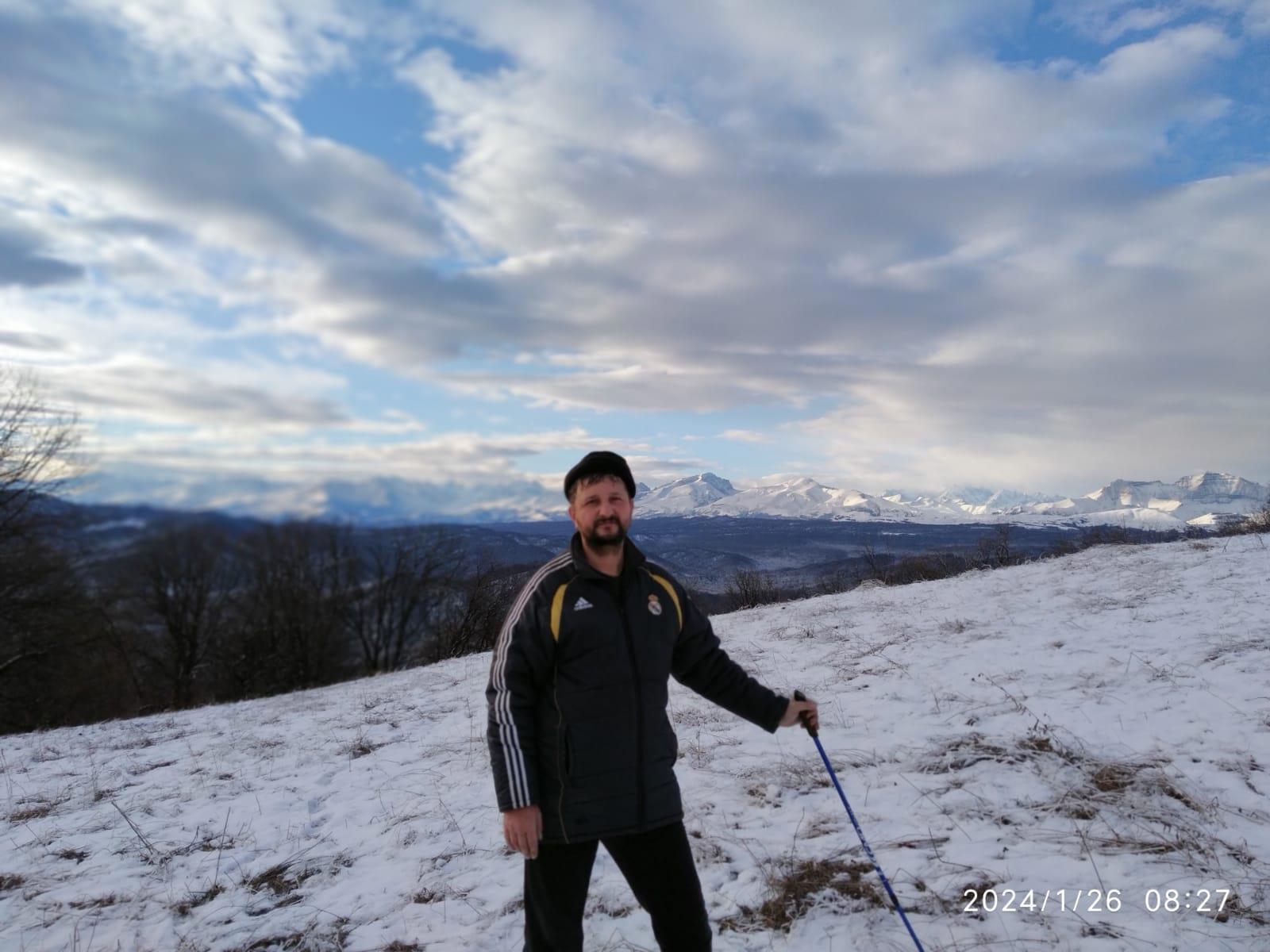 Сегодня поднялись на гору Сыр-Тала. Попили чай из термоса, на вершине горы, а потом спустились вниз. Поднимались в мороз, а спускались в оттепель. Всего ушло четыре часа, ну, чуть меньше. В горном лесу видели следы кабанов и волков.