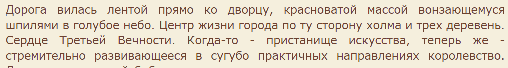 А ещё у автора волшебно получается описывать локации. Ты не только видишь эту реку времени, или королевский замок Третьего королевства Вечности, ты ощущаешь как будто лично побывал в Альгамбре, или Гранаде, куда судьба заносит героев.