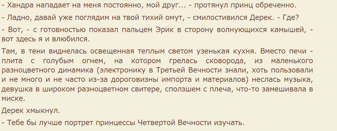 Здесь всё тоже очень сложно. Суровые законы, а отсутствие смерти вынуждает героев всю жизнь жить совсем не так, как им хочется. Нет, умереть-то можно. Просто не от старости. Например, отца принца Эрика... казнили. За мягкосердечие. А мать принцессы Клермоны умерла от усталости. Усталости жить.
