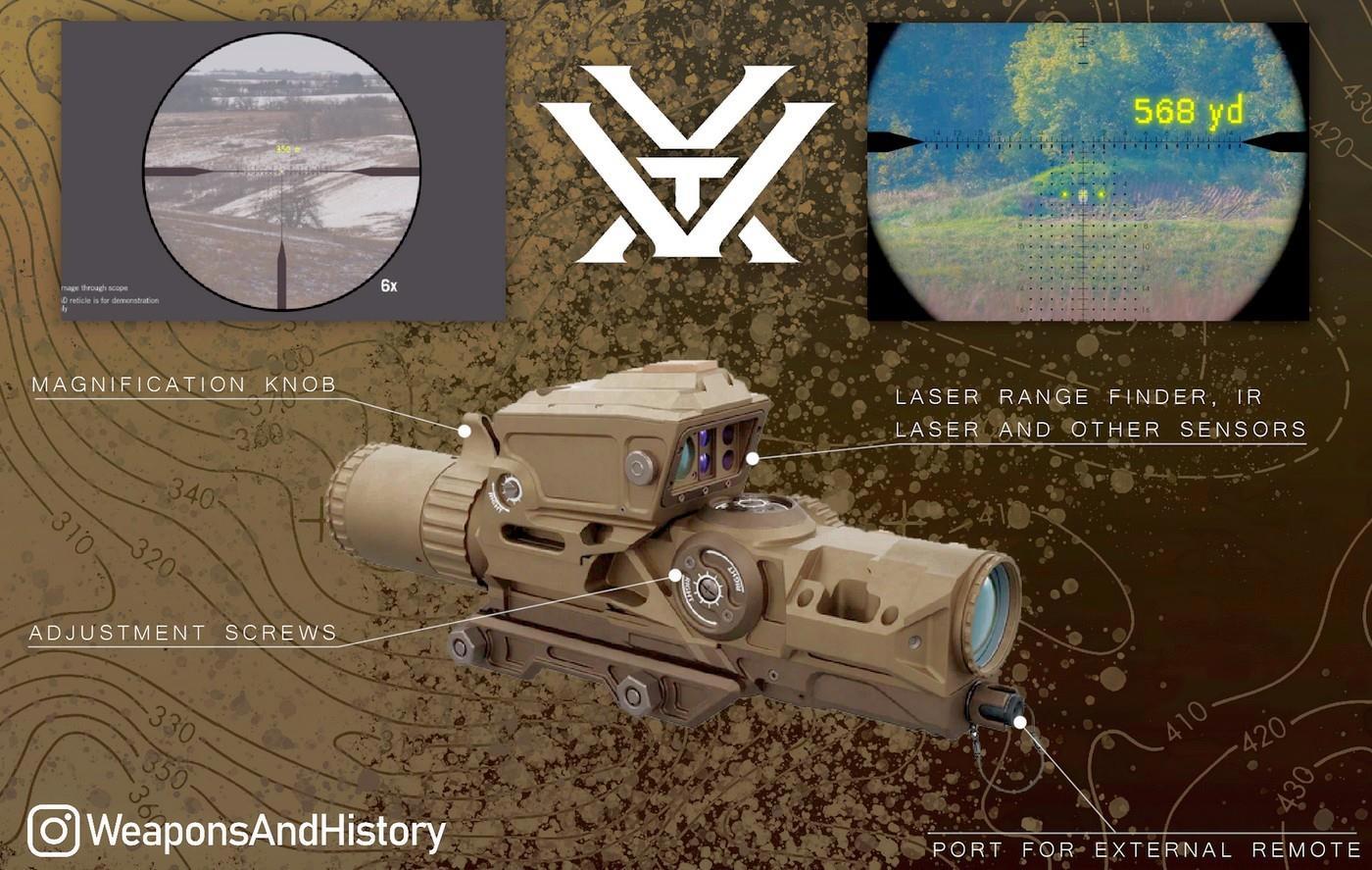 Винтовка XM7 без магазина и «обвеса» 4,5 кг (!). Глушитель у неё штатный (как и у пулемёта). Магазин на 20 патронов без вариантов весит 0,64 кг. В нормальный боекомплект входит 7 магазинов (6 в подсумках, 1 в автомате). То есть это ещё 4,5 кг. Всего 140 патронов. Но сюда нужно добавить ещё блок управления огнём «Vortex» XM157, который весит ещё 0,9 кг: