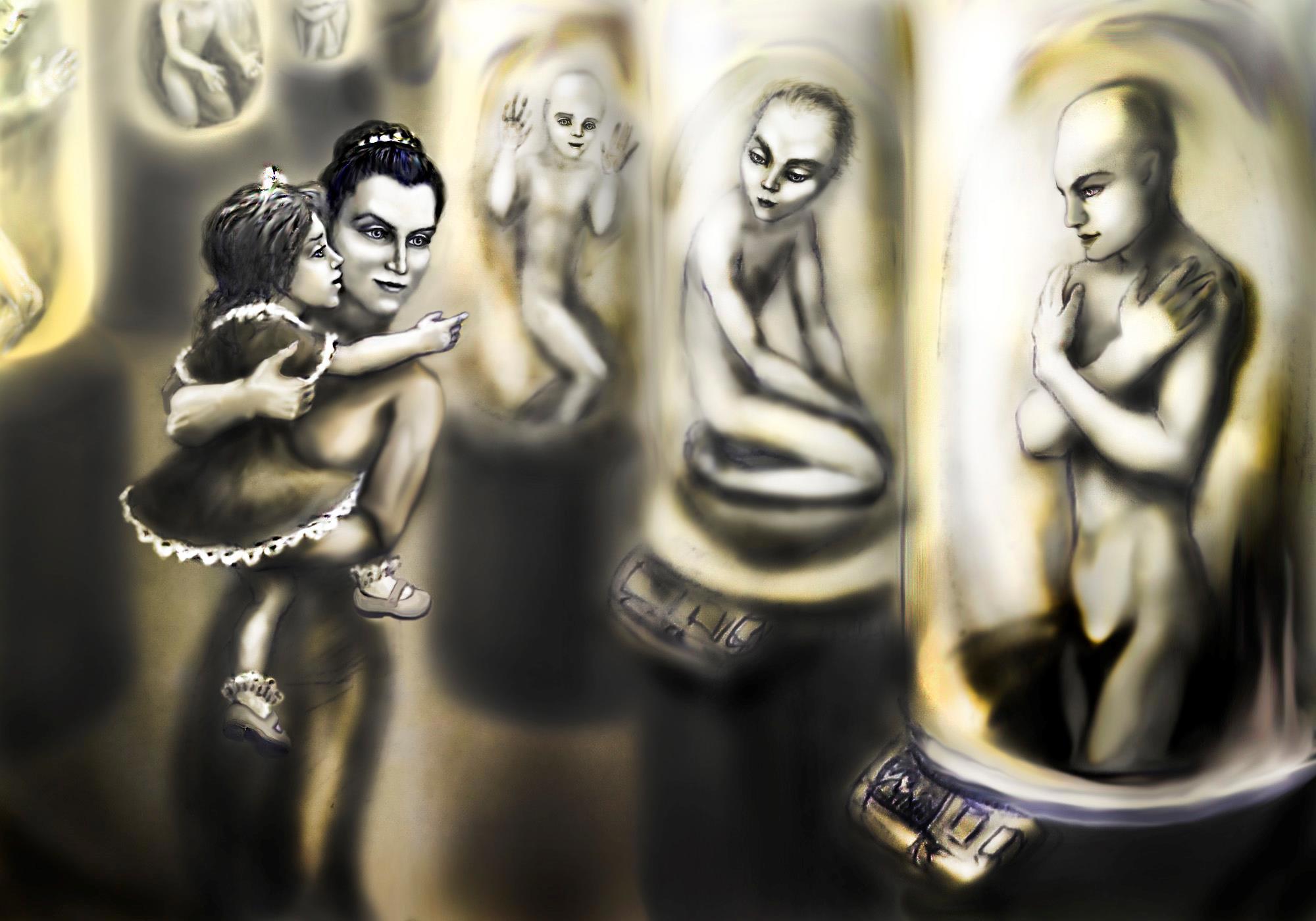 Автор: Leonardo de PushkarinyНаконец, обработала свою старую иллюстрацию к своей же книге "Гвардия их Величеств". Нарисовано было шариковой ручкой в блокноте. Сфотографировала, перенесла в фотошоп, и без использования кисти и пр., только затемнением, осветлением, пальцем, резкостью и размытием попыталась добиться эффекта тёмного зала и светящихся капсул с эмбрионами.