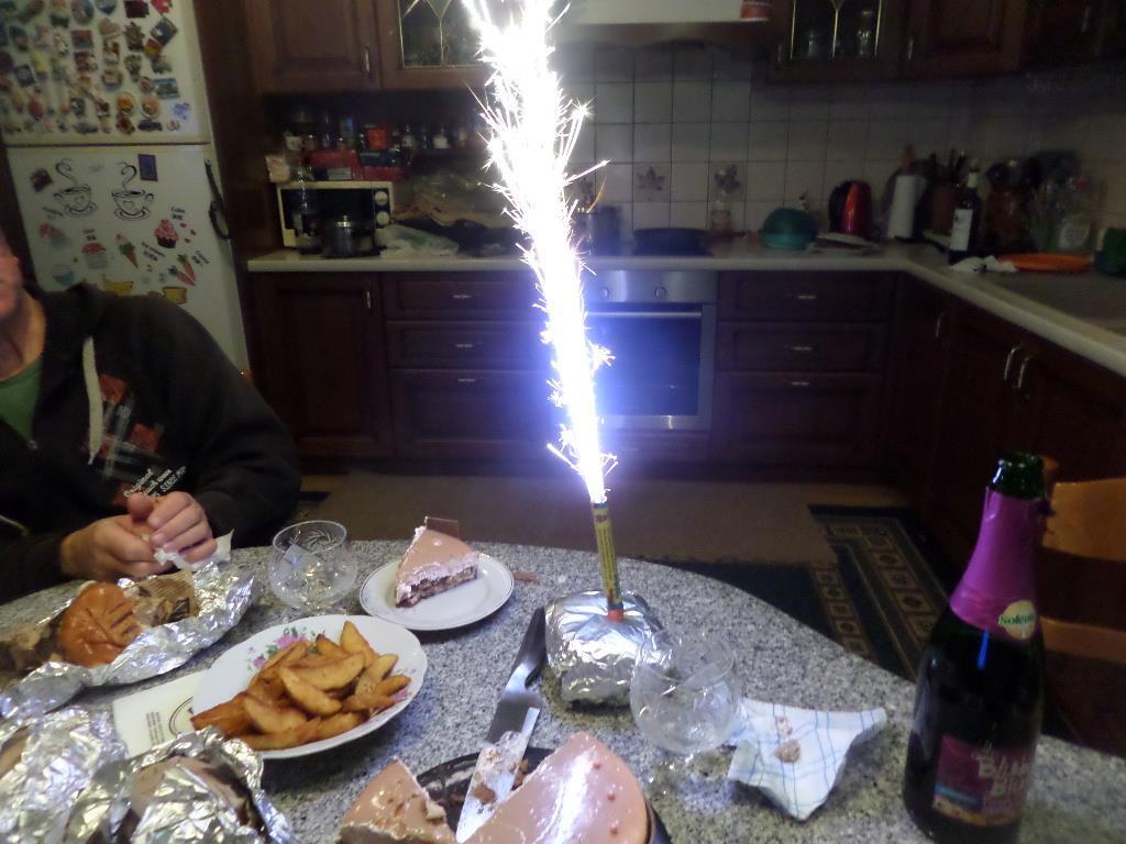 Внук самостоятельно заказал нам всем гамбургеры на свой вкус, по два на рыло, но мы не осилили, хотя было очень вкусно. Мама его купила торт, муж выволок из паутины бутылку вина. И все. Мы укушались сытной буржуйской едой, выпили по глоточку винца и чуть не спалили на хрен хату поджигая бенгальские огни. Все получилось шикарно. Все выжили.