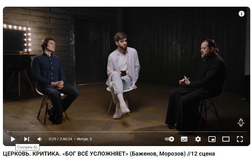 В самом начале передачи Серафим благодарил, что Евгений все же пришел на передачу, хотя до этого долго отказывался от нее, не желая общаться со сторонниками церкви. И вот тут у меня двоякое мнение. С одной стороны общение с людьми разных взглядов необходимо, но с другой стороны. Когда Баженов, один, пришел на встречу, где его ждало двое противников, то вполне логично, что в таком «поединке», а любая беседа — это всегда поединок, он безусловно проиграет.