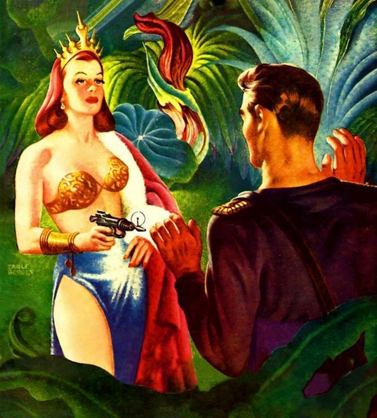 Эрл Берги (Earle Bergey) - американский художник и иллюстратор. Родился в 1901 году в Филадельфии, умер в 1952 году. Нарисовал тысячи иллюстраций для обложек детективов и paperback books. Данная работа выполнена в 1949 году для обложки февральского номера американского журнала "Thrilling Wonder Stories", иллюстрирующая рассказ А. Э. Ван Фогта под названием «The Weapon Shops of Isher».