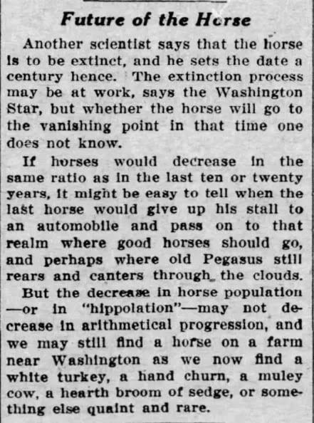 Сто лет назад, в эпоху появления первых авто, наши предки думали, что в будущем кони совсем исчезнут, так как у них отпадет потребность.