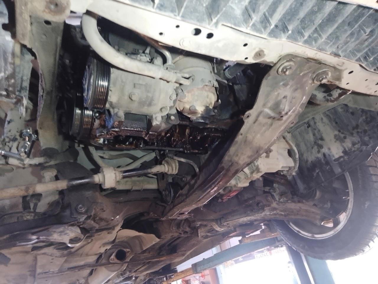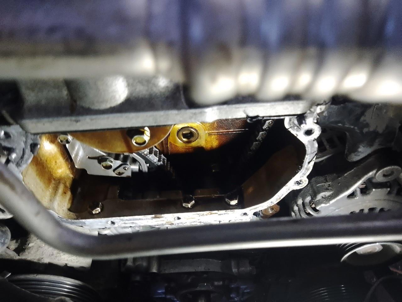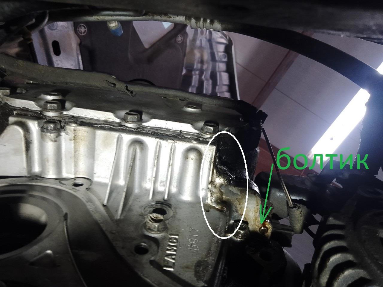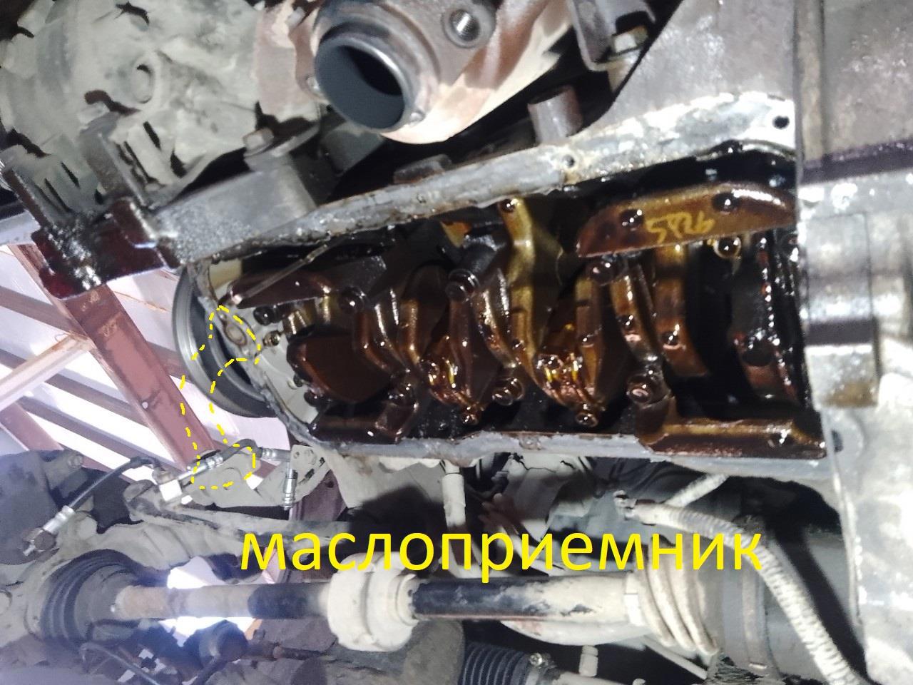 Не сняв поддон крышку не снять, мешает маслоприемник, который я уже открутил. Маслоприемник был без прокладки, это тоже бросилось в глаза. Окей. Ставим на место продольную лыжу, чтоб открутить правую подушку двигателя и освободить морду мотора. Вот в этом плане сделано удобно, хоть и разборки больше.