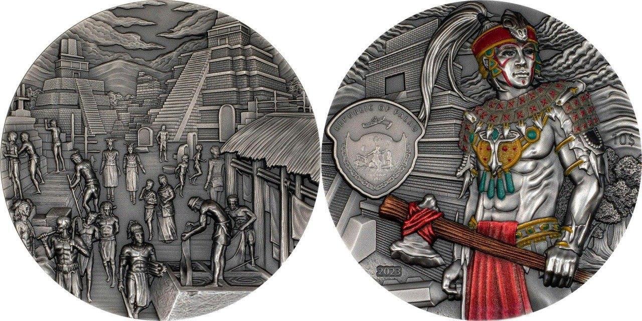 Майя, серия Утраченные цивилизации, Палау, 2 унц. серебро, антик финиш, тираж 555 шт.