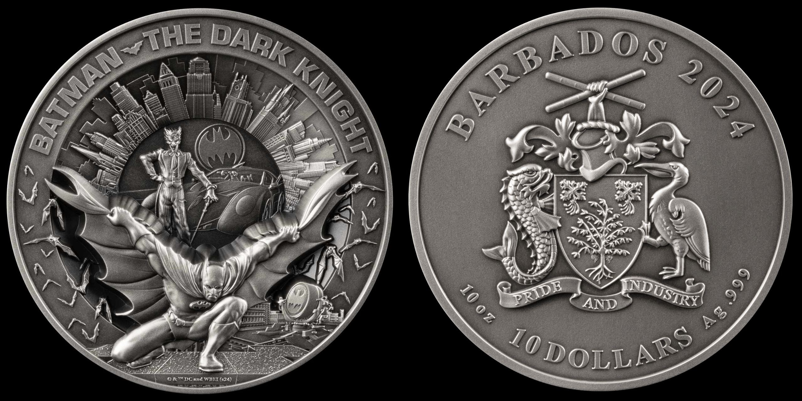 Серебряная монета Барбадоса - Бэтман Темный Рыцарь 2024, тираж 250 штук, вес 10 унций.