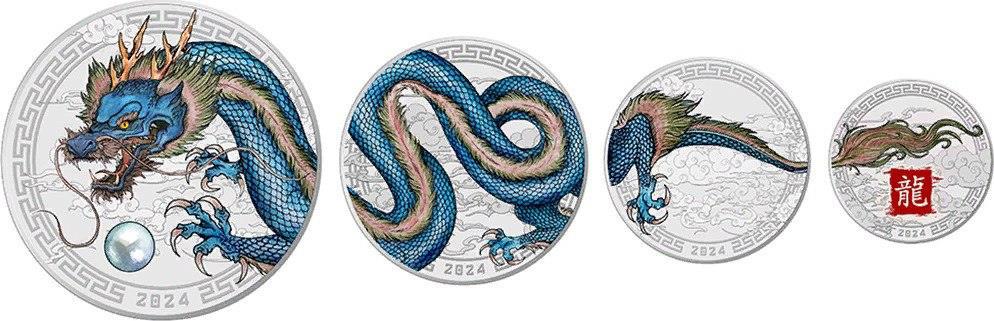 Дракон, набор 4 серебряных Монет, 1 унция (два доллара), ½ унции (один доллар), ¼ унции (полдоллара), 1/10 унции (четверть доллара). Фиджи, колоризированное серебро, тираж 888 шт.