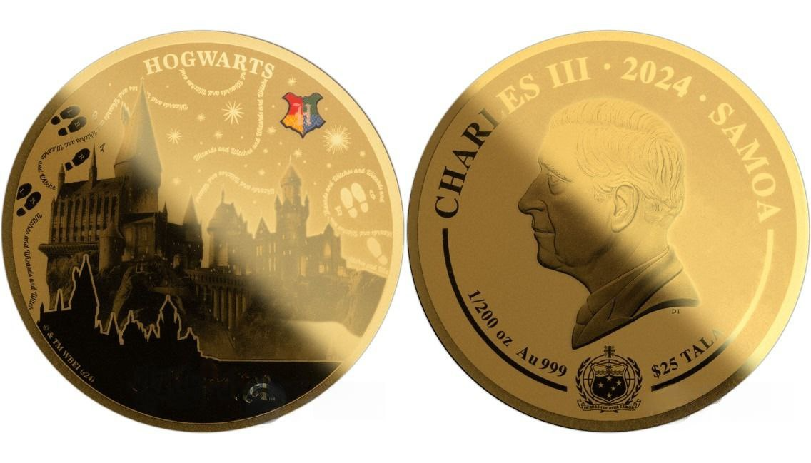 Впервые вижу монету с эффектом тени. Да еще по золоту. Монета называется Хогвартс, серия Гарри Поттер. Самоа, вес 0.155 гр., тираж 10 тыс.