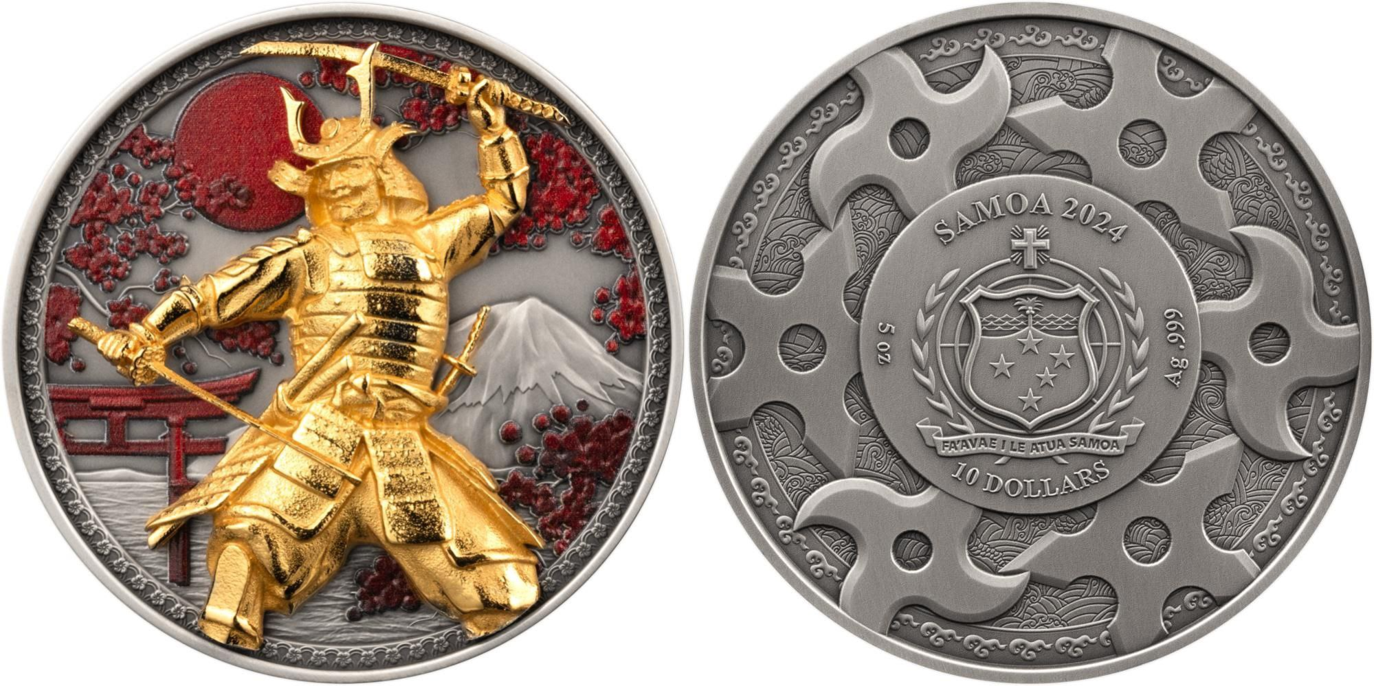 5-ти унцовый Самурай, Самоа. Серебро с позолотой, качество - Антик Финиш. Тираж - 399 шт.